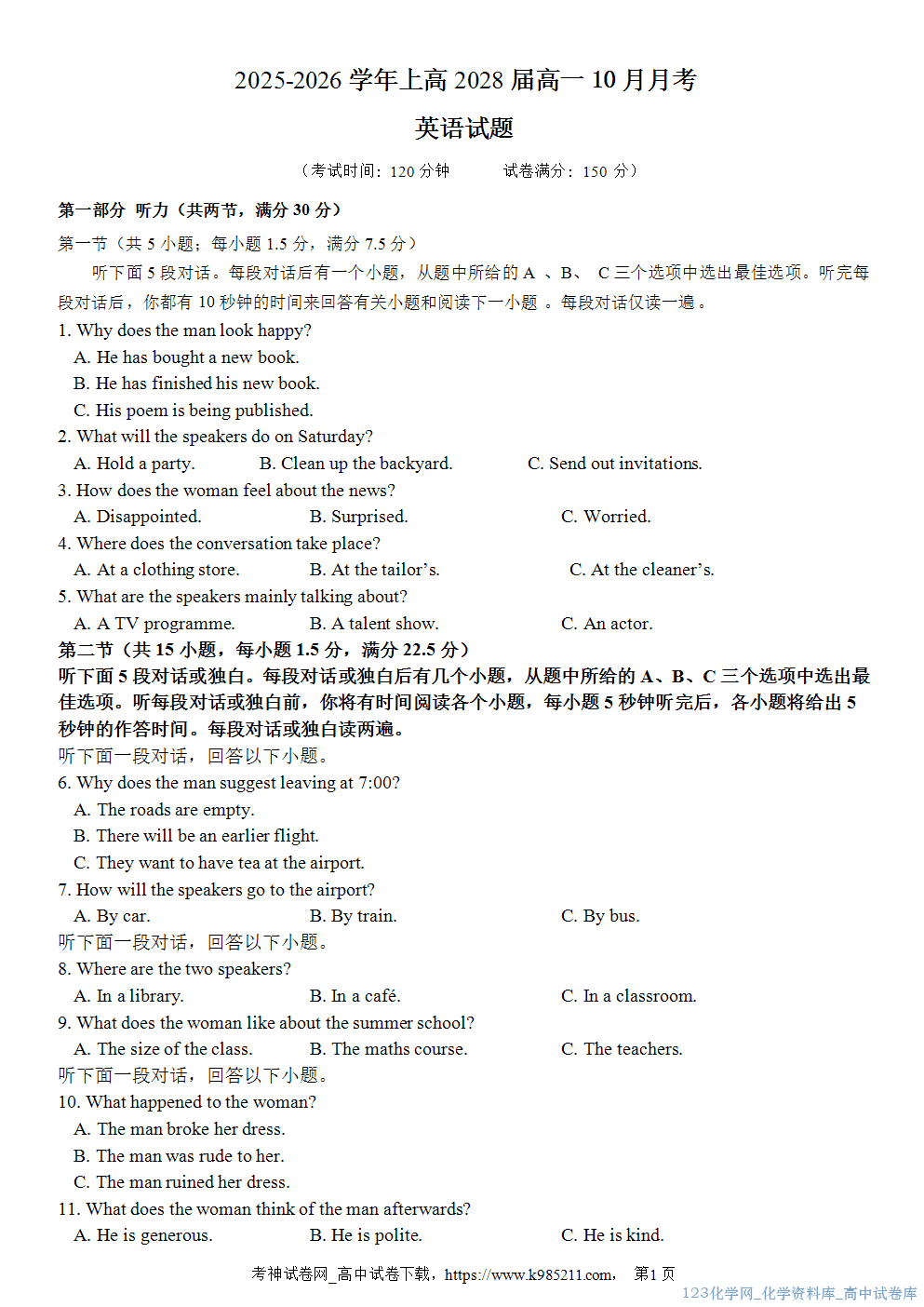 四川省内江市第一中学2025-2026学年高一上学期第一次月考英语试卷word版含答案解析
