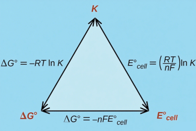 对于一个通用的电催化还原反应:Ox+ne-→Red。其标准吉布斯自由能变(ΔG⁰)与该反应的标准平衡电极电位(E⁰)通过能斯特方程的核心关系式紧密相连:ΔG⁰=-nFE⁰