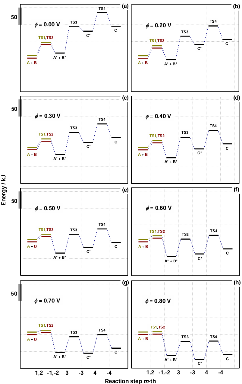 电化学过程的反应物(AB)、中间体(A∗B∗C∗)、产物(C)和过渡态(TS1TS2TS3TS4)之间在不同电位φ的相对能量图。DOI10.1021/acscatal.0c02359