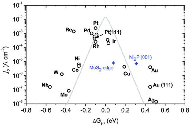 火山图(实验测量的交换电流密度j0作为理论H化学吸附自由能ΔGH*的函数)用于HER。DOI10.32657/10356/73265