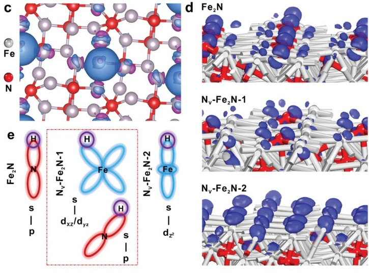 通过氢气氛围退火构建N空位,模拟显示适度N空位使H在N/Fe位点的吸附能分别为-0.08/-0.14eV(接近热力学中性);进一步分析发现,N空位不足/过量时,N/Fe的空轨道呈垂直表面取向(虽利于H吸附,但阻碍脱附),而适度空位使N轨道倾斜、Fe轨道功能改变,电子耦合从H 1s-N pz转为H 1s-Fe d,同时优化H吸附与脱附。