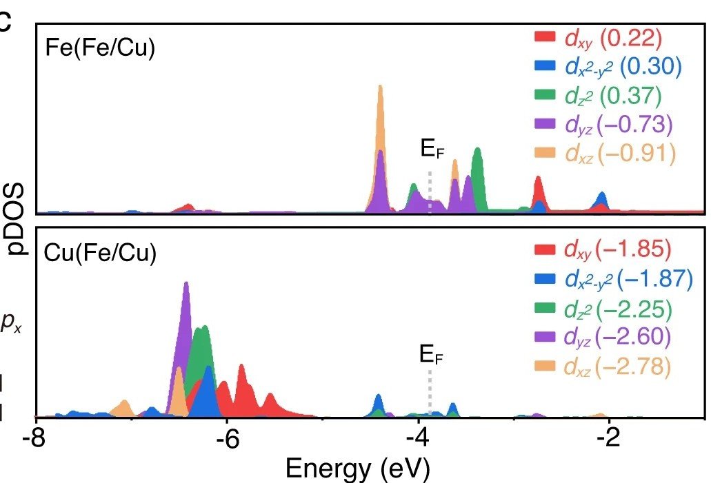 因此,双原子中心与NO₃⁻之间形成强相互作用:更准确地说,Fe/Cu的3dxz轨道与NO₃⁻中两个氧原子的2px轨道发生耦合。