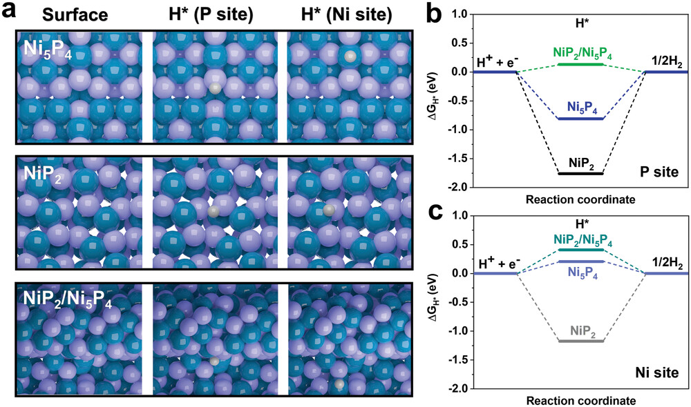 如图2所示,研究人员采用阴离子取代策略,设计出自立式面NiP₂/Ni₅P₄异质结构。理论计算结果表明,H更倾向于吸附在P位点上,且该位点的ΔGH*(氢吸附自由能)比邻近Ni位点更负。