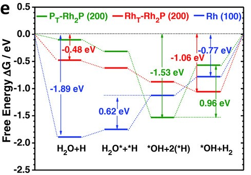 图4. (e)在碱性条件下,P端基表面(PT-Rh₂P (200))、Rh端基表面(RhT-Rh₂P (200))和Rh (100)表面析氢反应的自由能路径(ΔG)。DOI: 10.1002/aenm.201801891