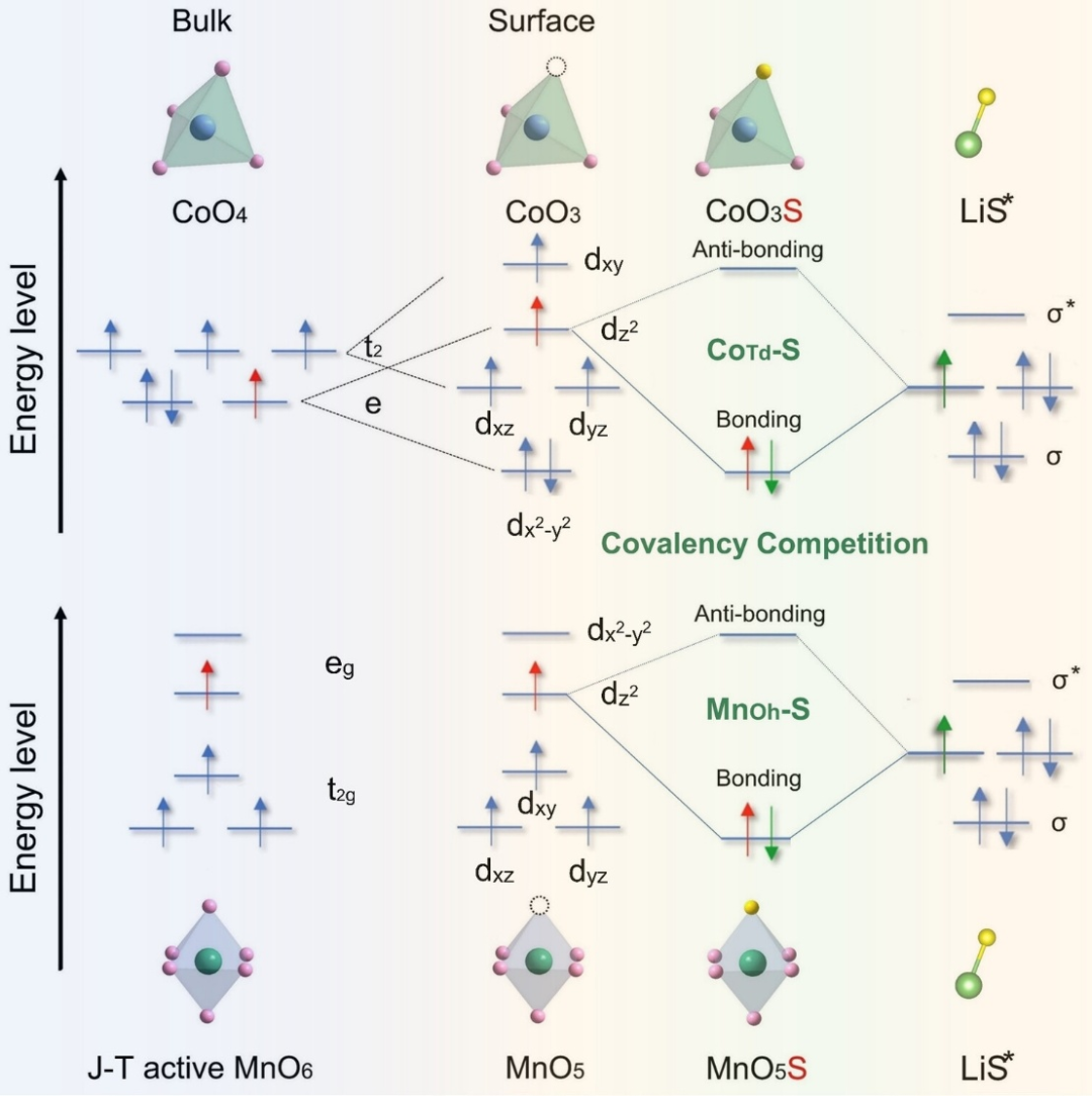 图1. 示意图:LiS*中间体与Co³⁺Td和Mn³⁺Oh位点的3d轨道之间的有利相互作用。DOI: 10.1002/anie.202216286