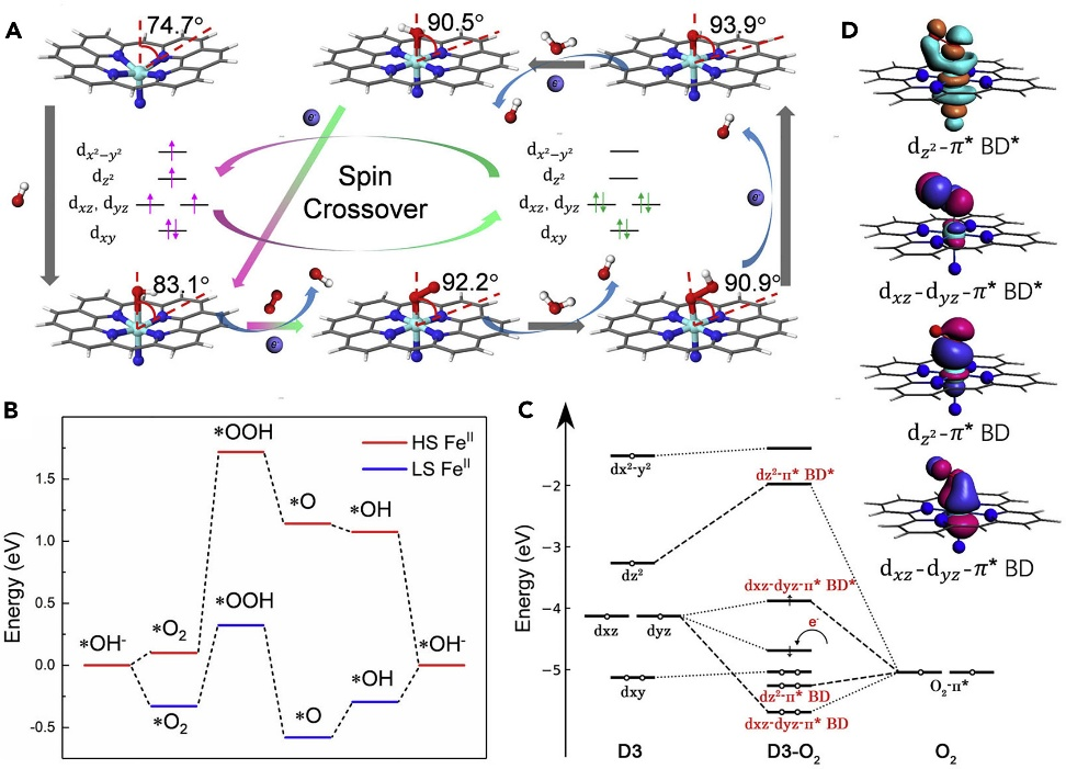 图9. (A)ORR过程中N-FeN₄C₁₀基团的结构与动力学特征,给出了优化后的几何构型(图中角度表示铁原子相对于N₄平面的偏离角度)。(B)N-FeN₄C₁₀基团在碱性介质中发生氧还原反应(U = 0.401 V)时的势能剖面。蓝色曲线表示伴随自旋交叉的情况,红色曲线表示无自旋交叉的情况。(C)O₂与N-FeN₄C₁₀基团之间的轨道相互作用示意图(主要相互作用发生在dxz、dyz轨道与O₂的π*轨道之间)。(D)O₂与N-FeN₄C₁₀基团相互作用的自然定域化分子轨道(NLMOs)示意图。