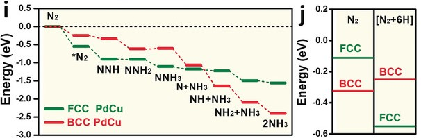 图6.(i)氮还原反应(NRR)在体心立方(BCC)PdCu和面心立方(FCC)PdCu 表面上的能量路径对比。(j)N₂+6 H与N₂分别直接吸附于体心立方(BCC)PdCu 和面心立方(FCC)PdCu表面的吸附行为比较。DOI: 10.1002/anie.201913122