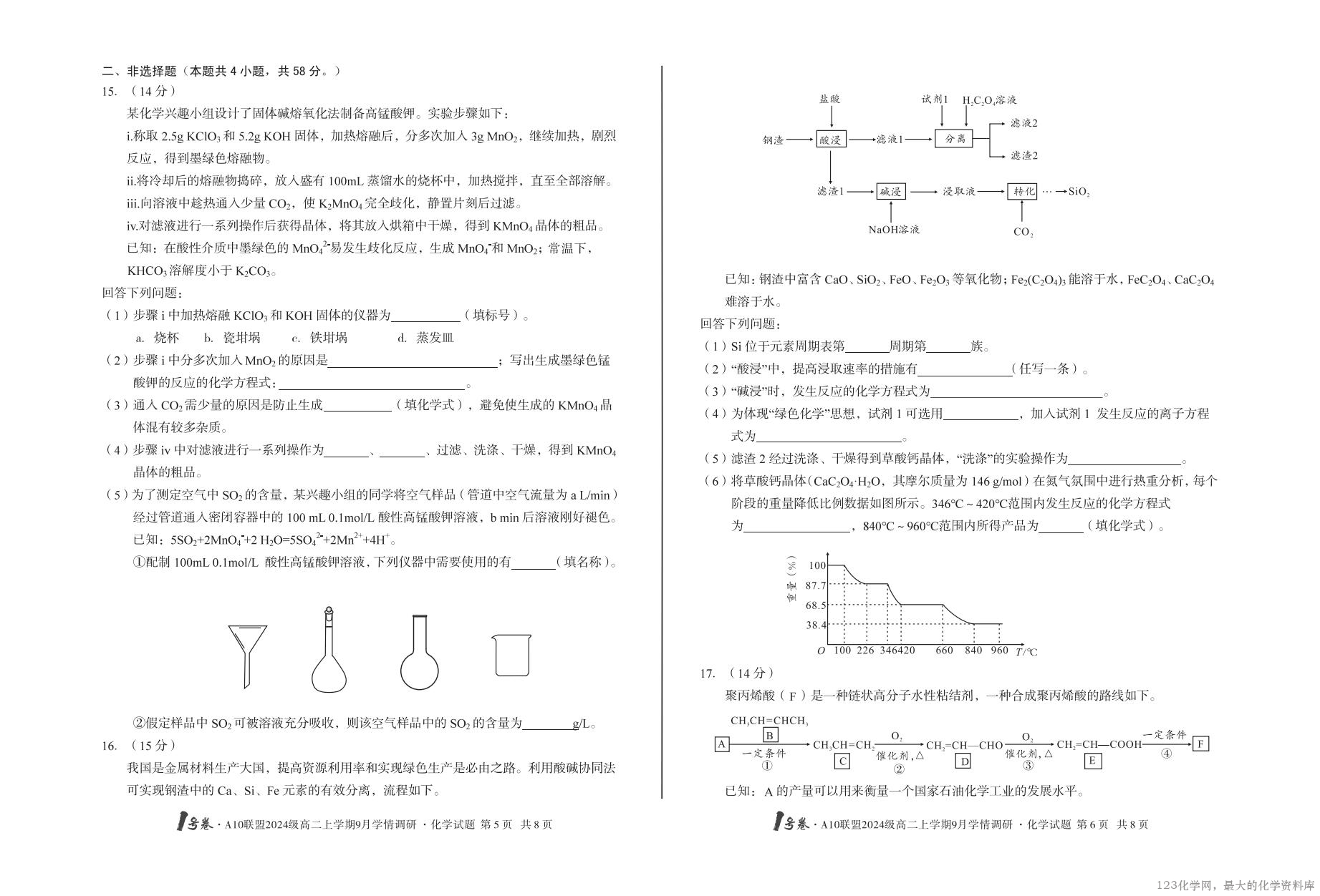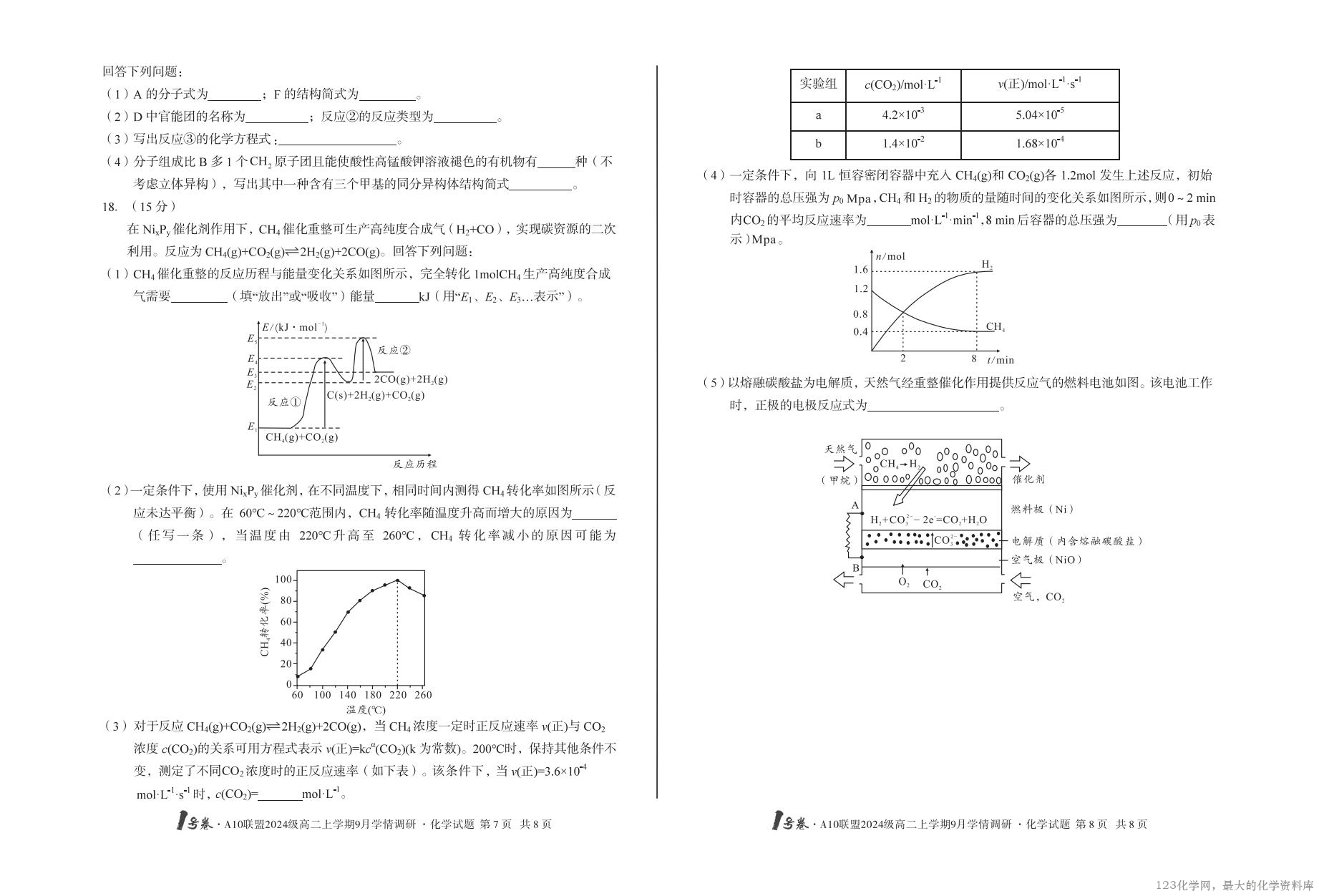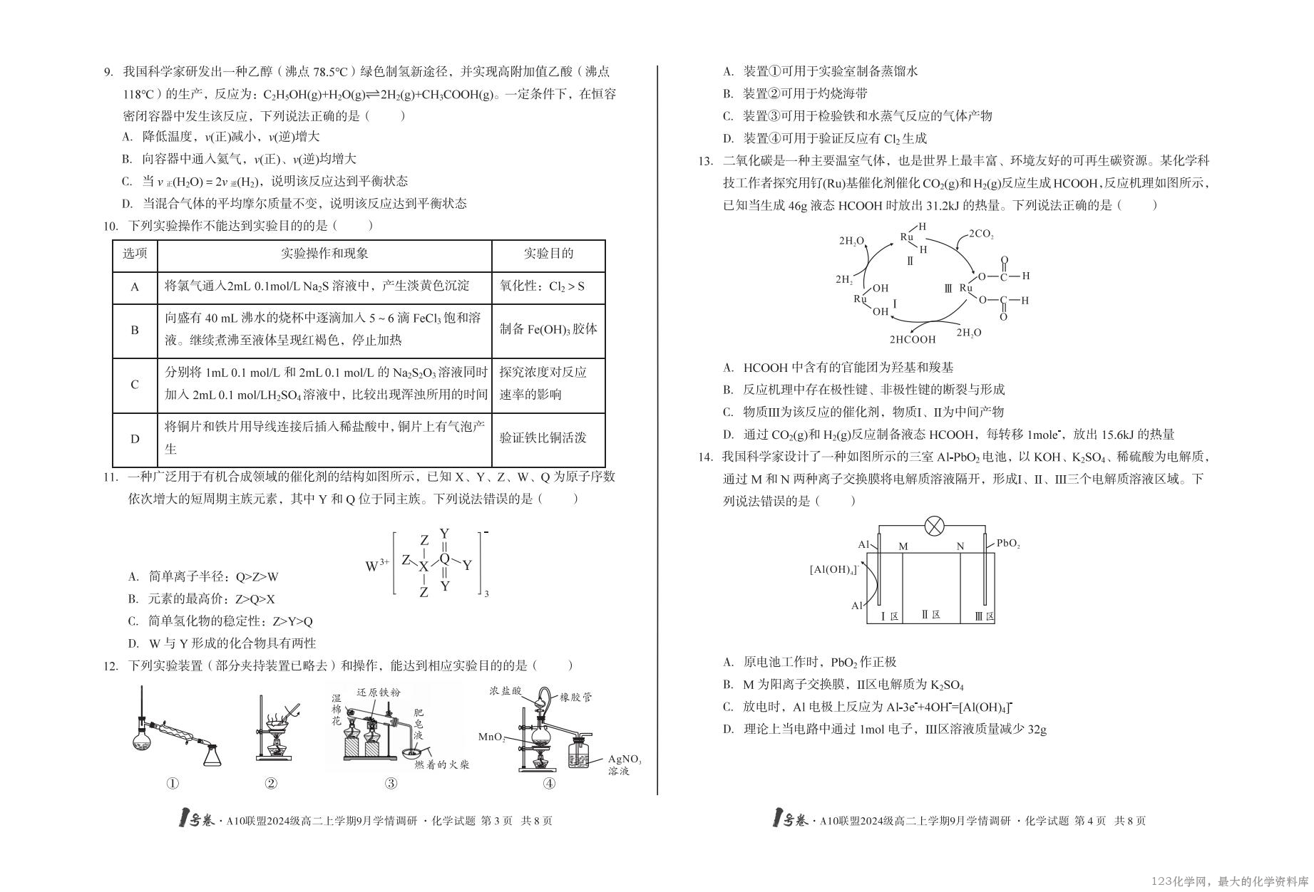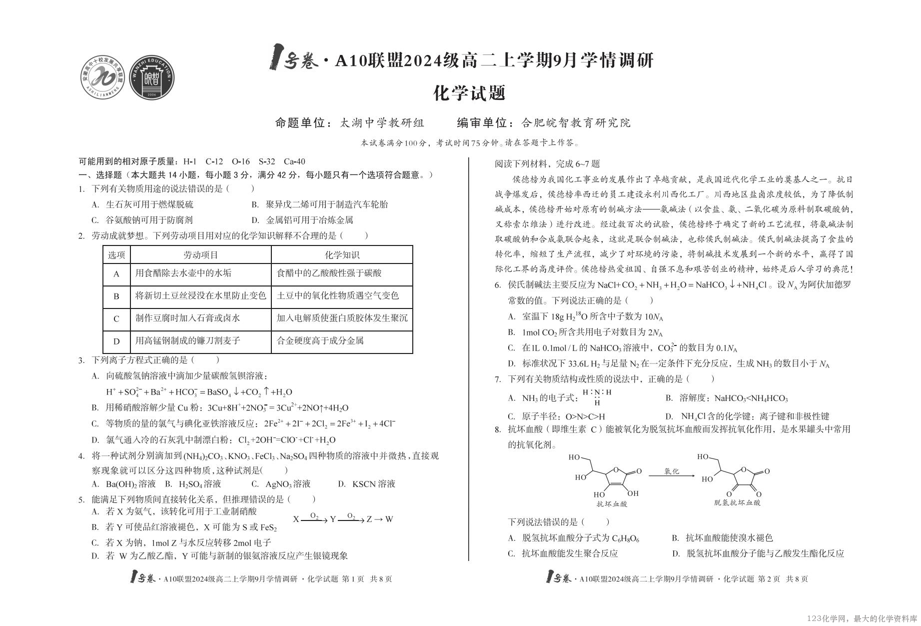 安徽省A10联盟2024级高二上学期9月学情调研考试化学试卷含答案