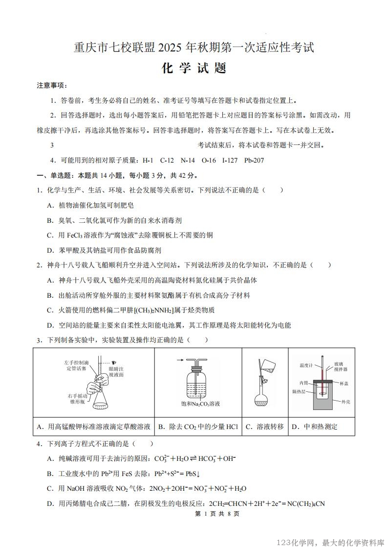 重庆市七校联盟2025年秋期高三第一次适应性考试化学试卷含答案