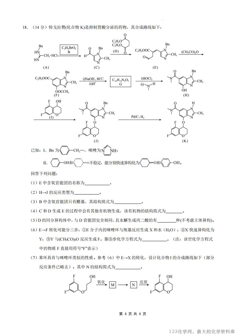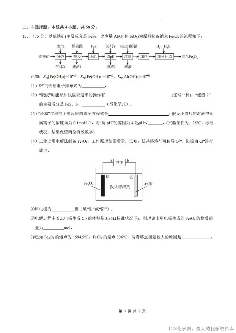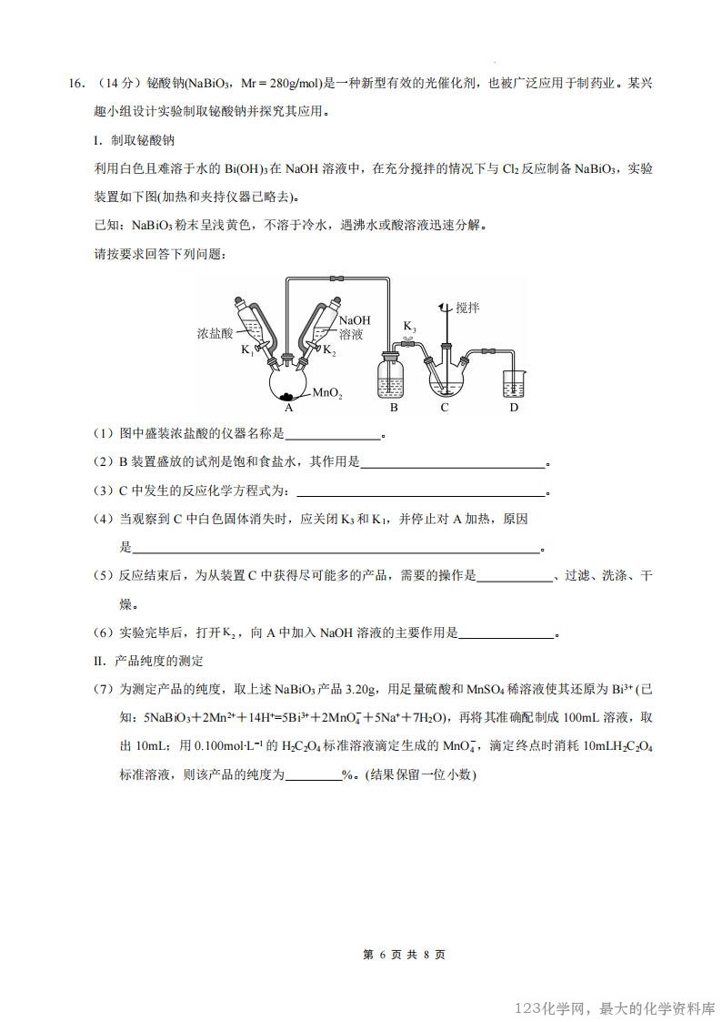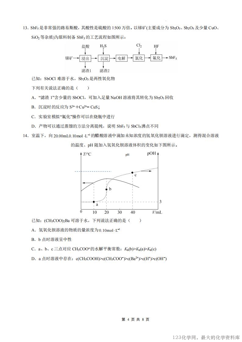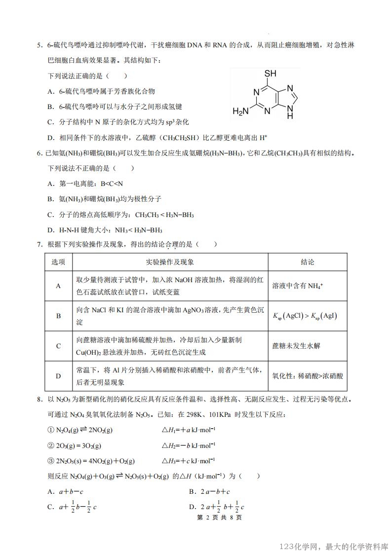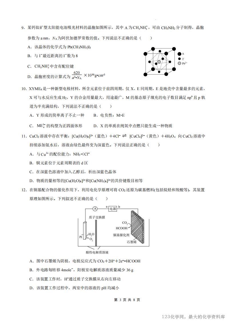 1.答卷前,考生务必将自己的姓名、准考证号等填写在答题卡和试卷指定位置上。 2.回答选择题时,选出每小题答案后,用铅笔把答题卡上对应题目的答案标号涂黑。如需改动,用 橡皮擦干净后,再选涂其他答案标号。回答非选择题时,将答案写在答题卡上。写在本试卷上无效。 3 考试结束后,将本试卷和答题卡一并交回。 4.可能用到的相对原子质量:H-1 C-12 N-14 O-16 I-127 Pb-207 一、单选题:本题共 14 小题,每小题 3 分,共 42 分。 1.化学与生产、生活、环境、社会发展等关系密切。下列说法不正确的是( ) A.植物油催化加氢可制肥皂 B.臭氧、二氧化氯可作为新的自来水消毒剂 C.用 FeCl3溶液作为“腐蚀液”去除覆铜板上不需要的铜 D.苯甲酸及其钠盐可用作食品防腐剂 2.神舟十八号载人飞船顺利升空并进入空间站。下列说法所涉及的化学知识,不正确的是( ) A.神舟十八号载人飞船外壳采用的高温陶瓷材料氮化硅属于共价晶体 B.出舱活动所穿舱外服的主要材料聚氨酯属于有机合成高分子材料 C.火箭使用的燃料偏二甲肼[(CH3)2NNH2]属于烃类物质 D.空间站的能量主要来自柔性太阳能电池翼,其工作原理是将太阳能转化为电能