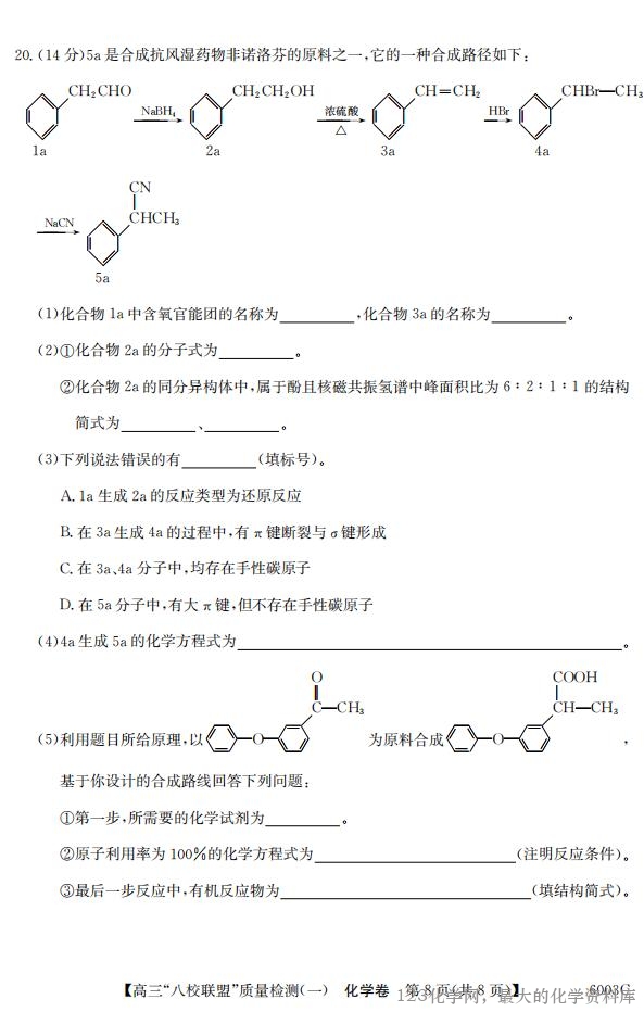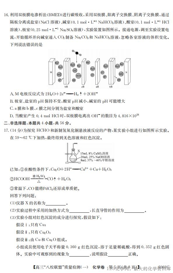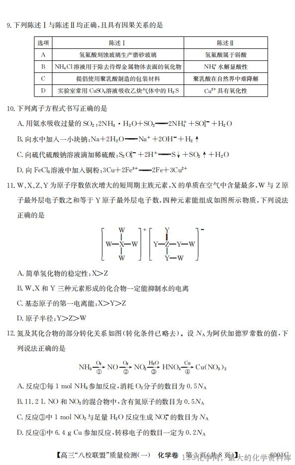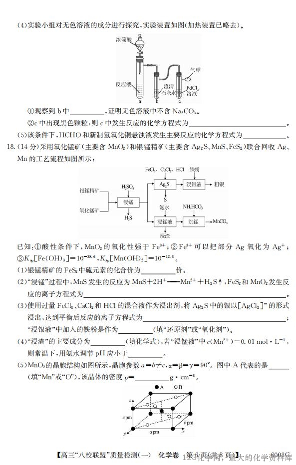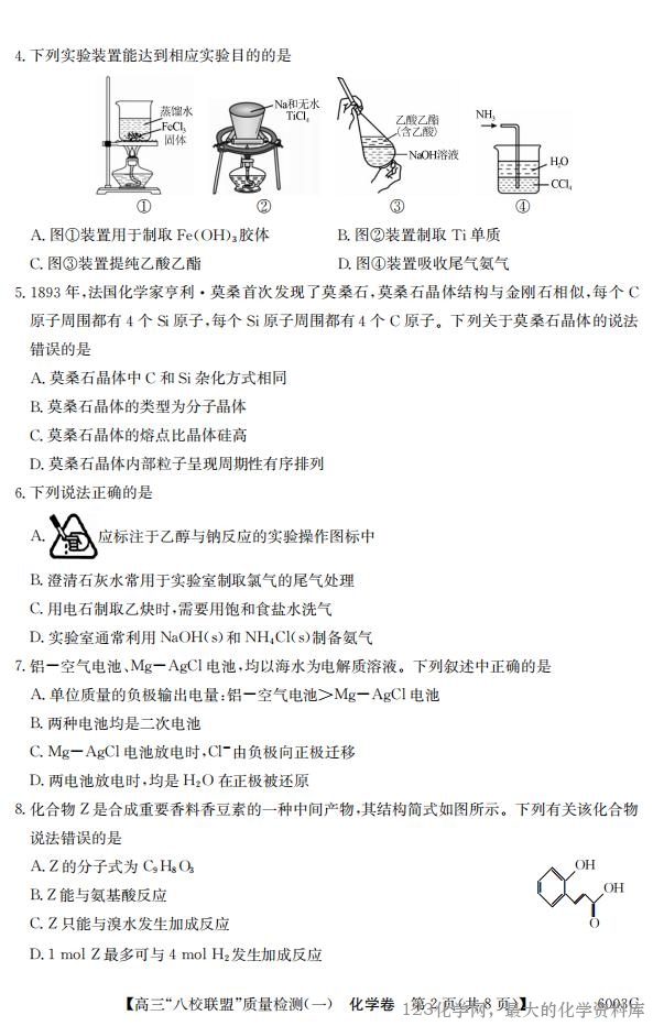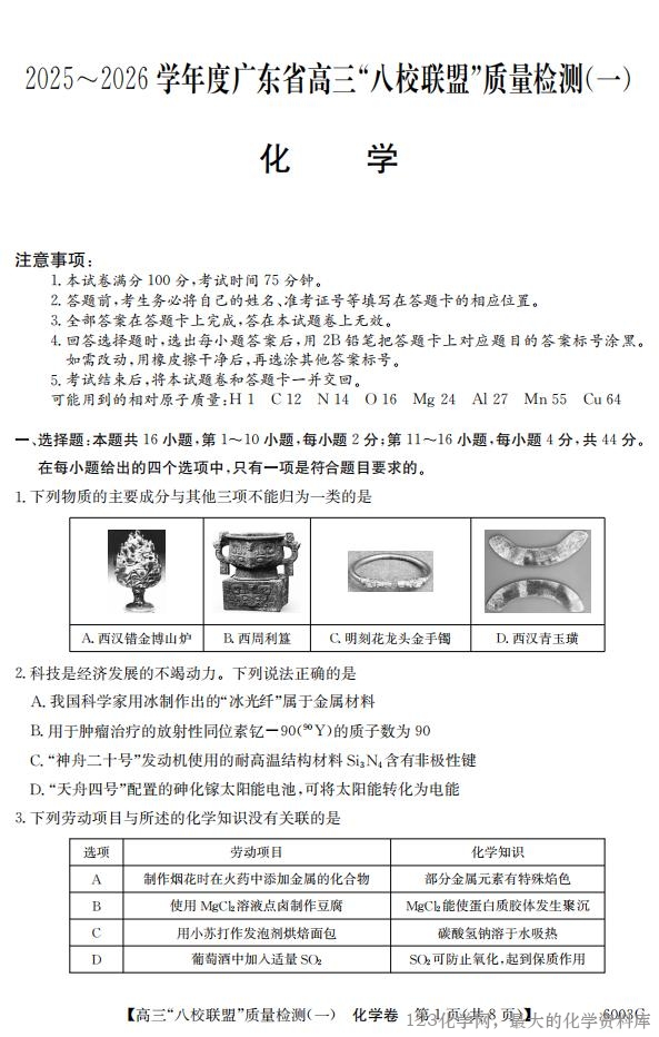 广东省清远市八校联盟2025-2026学年高三质量检测(一)(6003C)(8.6-8.7)化学试卷含答案