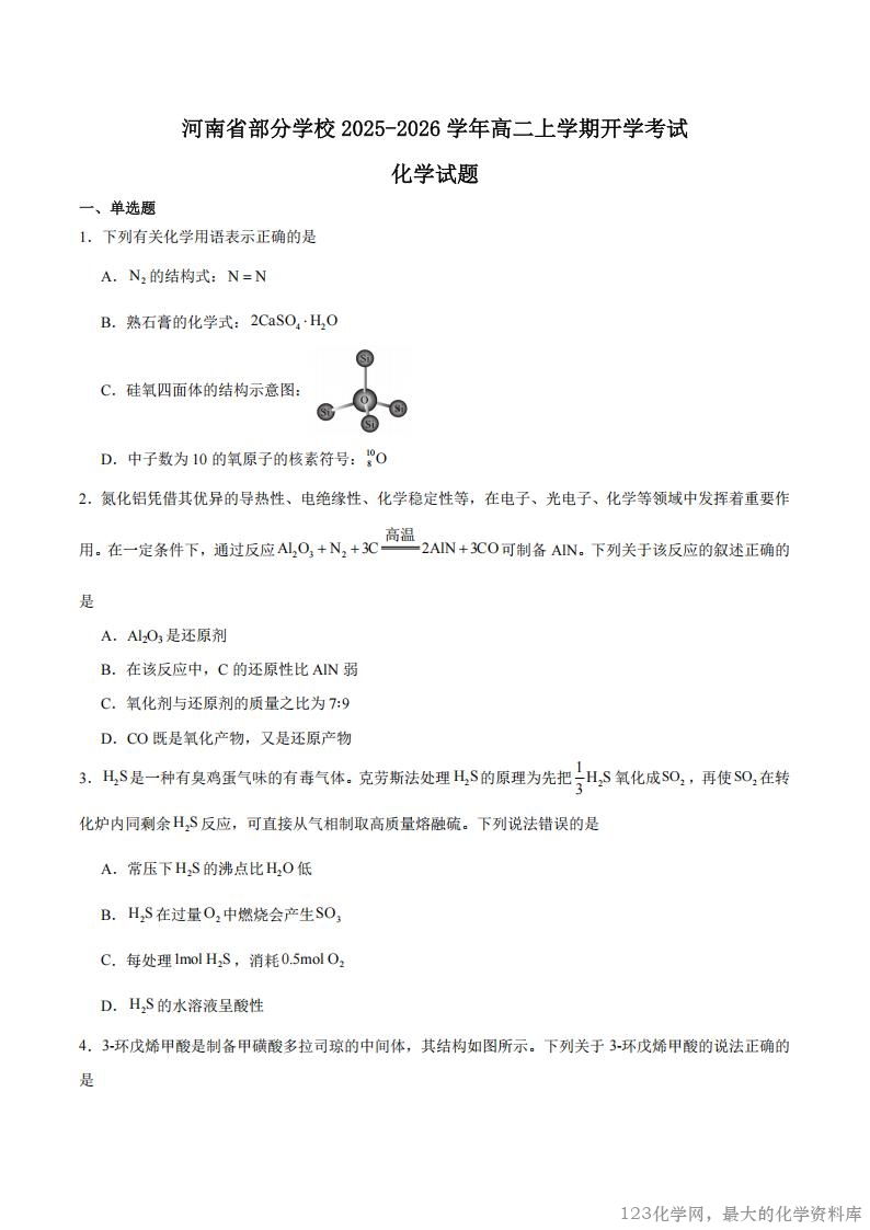 河南省部分学校2025-2026学年高二上学期开学考试 化学 Word版含答案