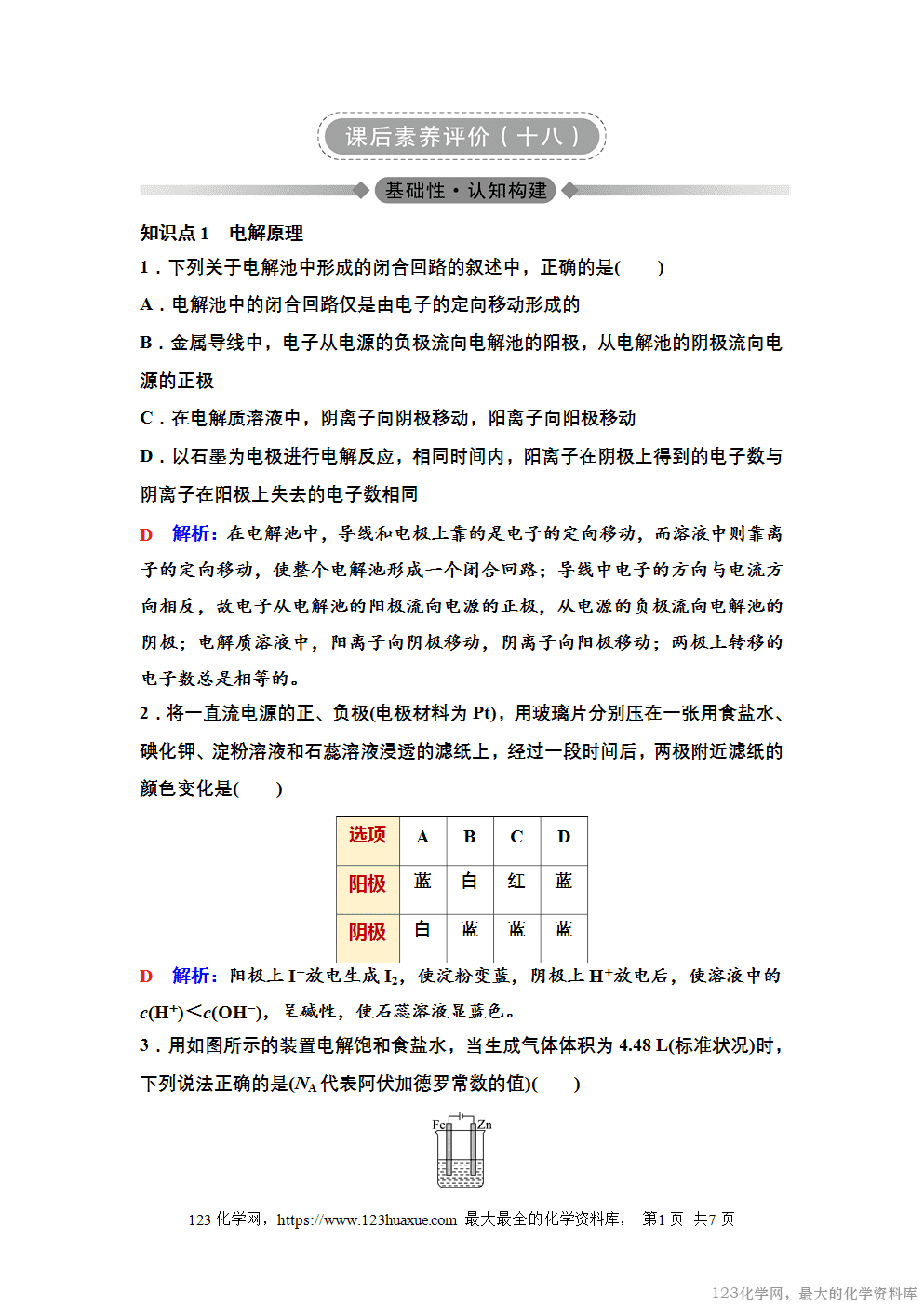 2025年秋季高中化学人教版选择性必修1《化学反应原理》18 课后素养评价(十八)电解原理word版含答案