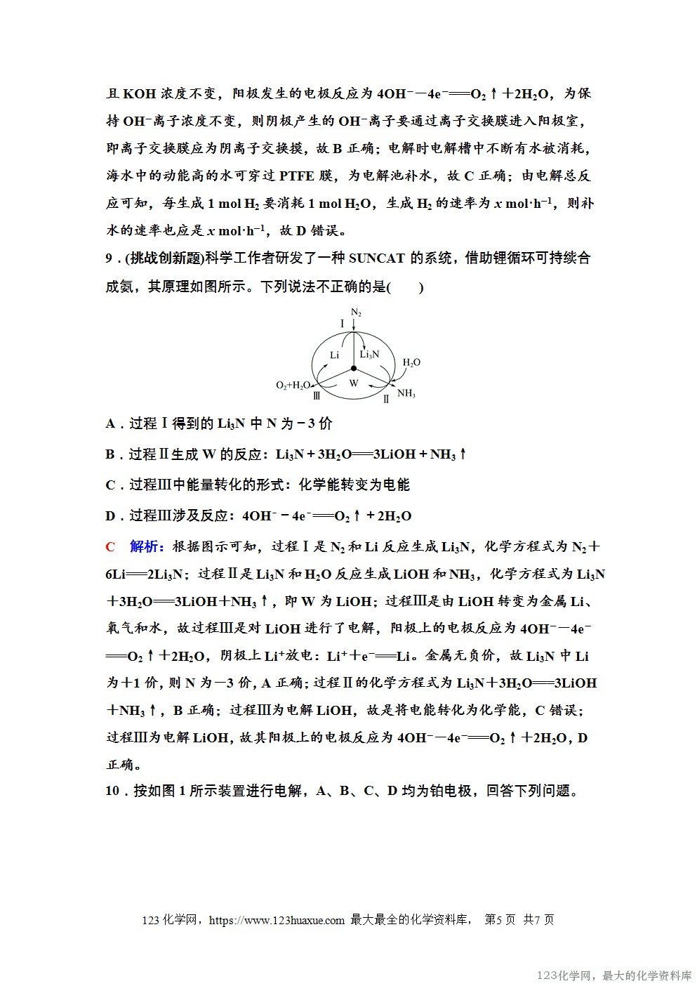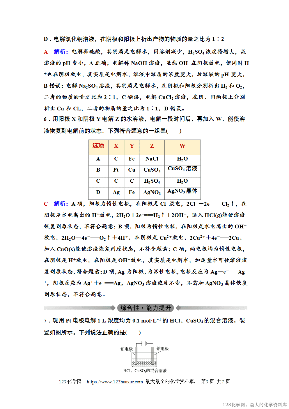 D 解析:在电解池中,导线和电极上靠的是电子的定向移动,而溶液中则靠离子的定向移动,使整个电解池形成一个闭合回路;导线中电子的方向与电流方向相反,故电子从电解池的阳极流向电源的正极,从电源的负极流向电解池的阴极;电解质溶液中,阳离子向阴极移动,阴离子向阳极移动;两极上转移的电子数总是相等的。