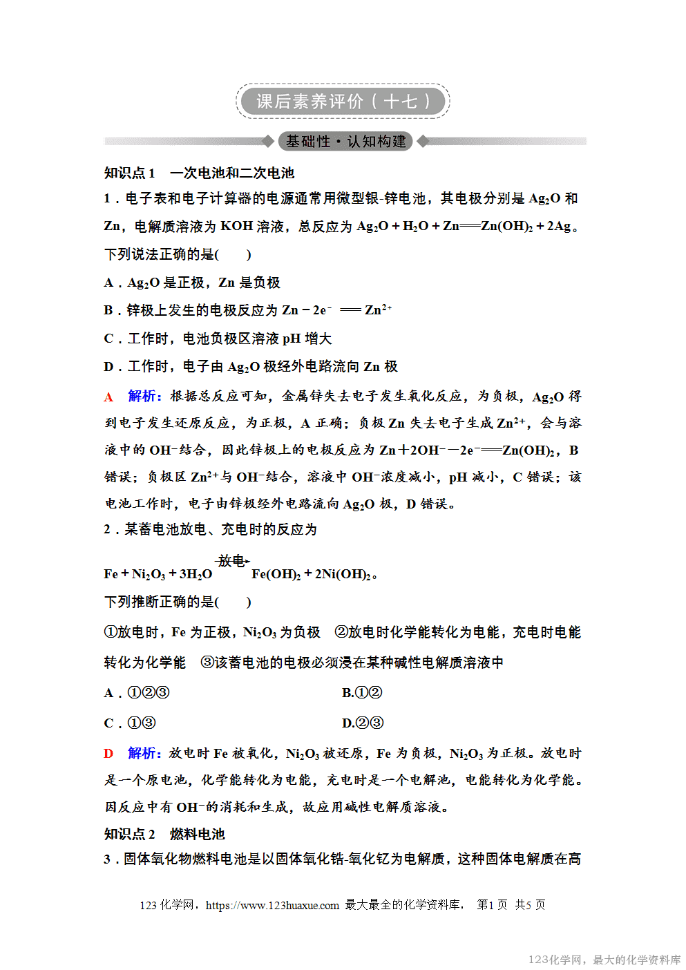 A 解析:根据总反应可知,金属锌失去电子发生氧化反应,为负极,Ag2O得到电子发生还原反应,为正极,A正确;负极Zn失去电子生成Zn2+,会与溶液中的OH―结合,因此锌极上的电极反应为Zn+2OH―-2e-===Zn(OH)2,B错误;负极区Zn2+与OH―结合,溶液中OH―浓度减小,pH减小,C错误;该电池工作时,电子由锌极经外电路流向Ag2O极,D错误。