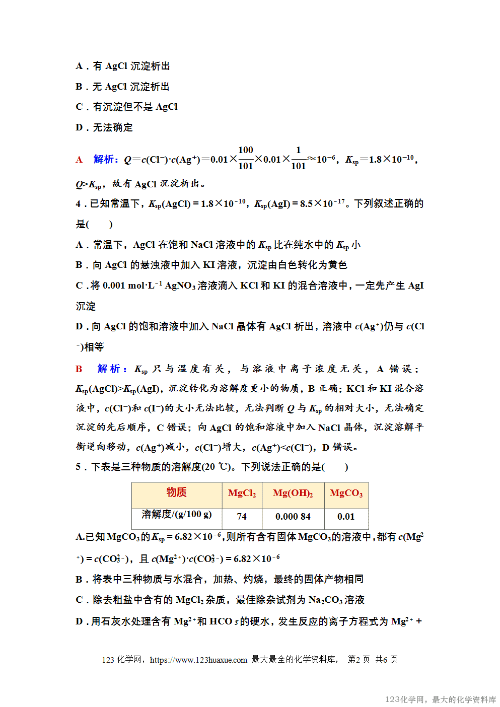 A 解析:Q=c(Cl-)·c(Ag+)=0.01××0.01×≈10-6,Ksp=1.8×10-10,Q>Ksp,故有AgCl沉淀析出。