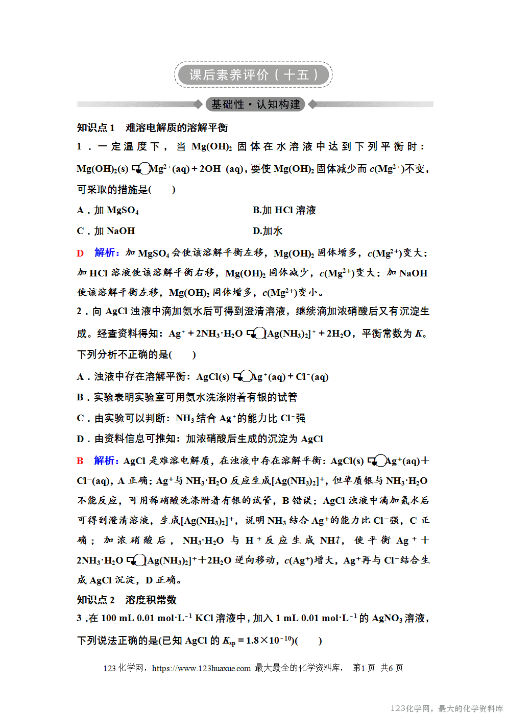2025年秋季高中化学人教版选择性必修1《化学反应原理》15 课后素养评价(十五)沉淀溶解平衡word版含答案