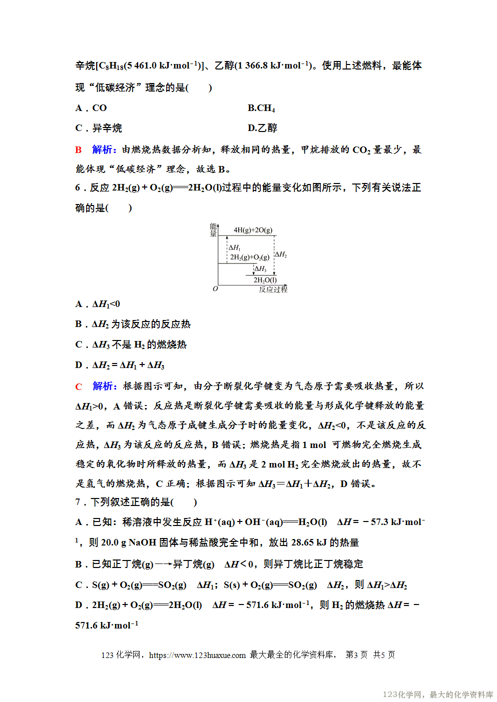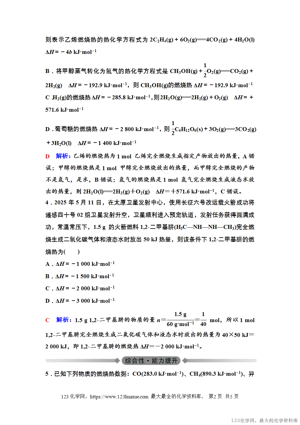D 解析:乙烯的燃烧热为1 mol 乙烯完全燃烧生成指定产物放出的热量,A错误;甲醇的燃烧热是1 mol 甲醇完全燃烧放出的热量,而甲醇完全燃烧的产物不是氢气,是水,B错误;氢气的燃烧热是1 mol 氢气完全燃烧生成液态水放出的热量,则2H2O(l)===2H2(g)+O2(g) ΔH=+571.6 kJ·mol-1,C错误。