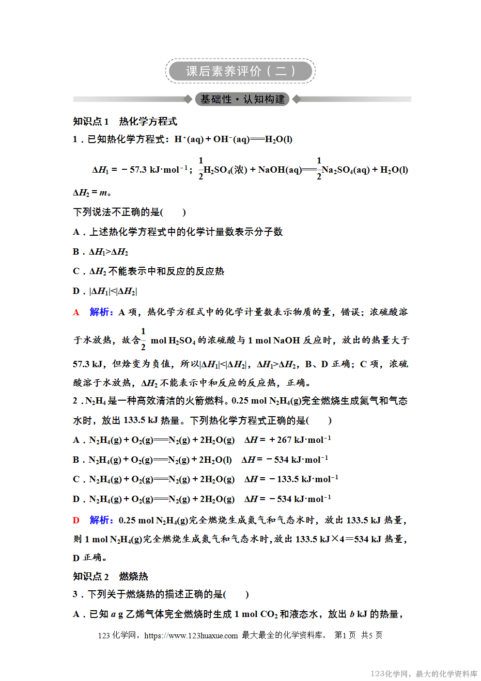 2025年秋季高中化学人教版选择性必修1《化学反应原理》02 课后素养评价(二)热化学方程式燃烧热word版含答案