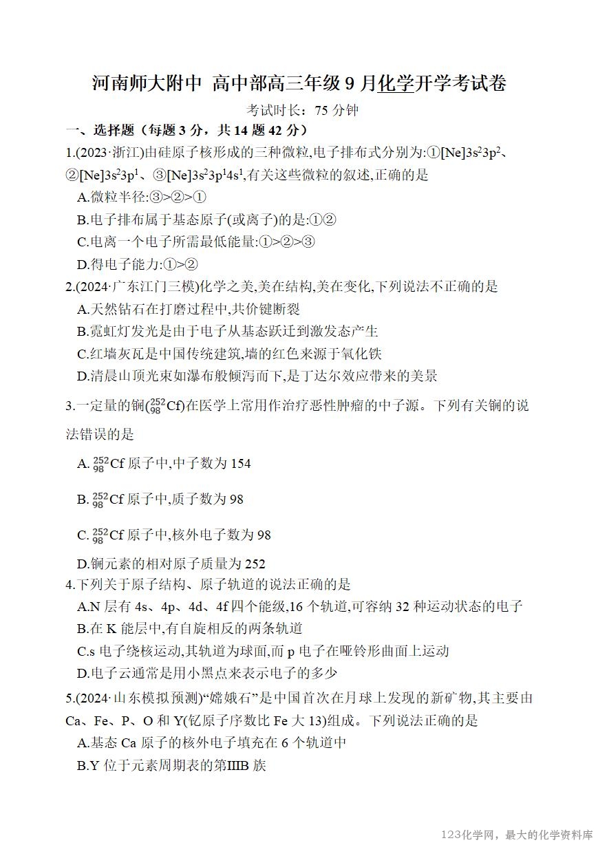 河南师大附中 高中部高三年级9月化学开学考试卷