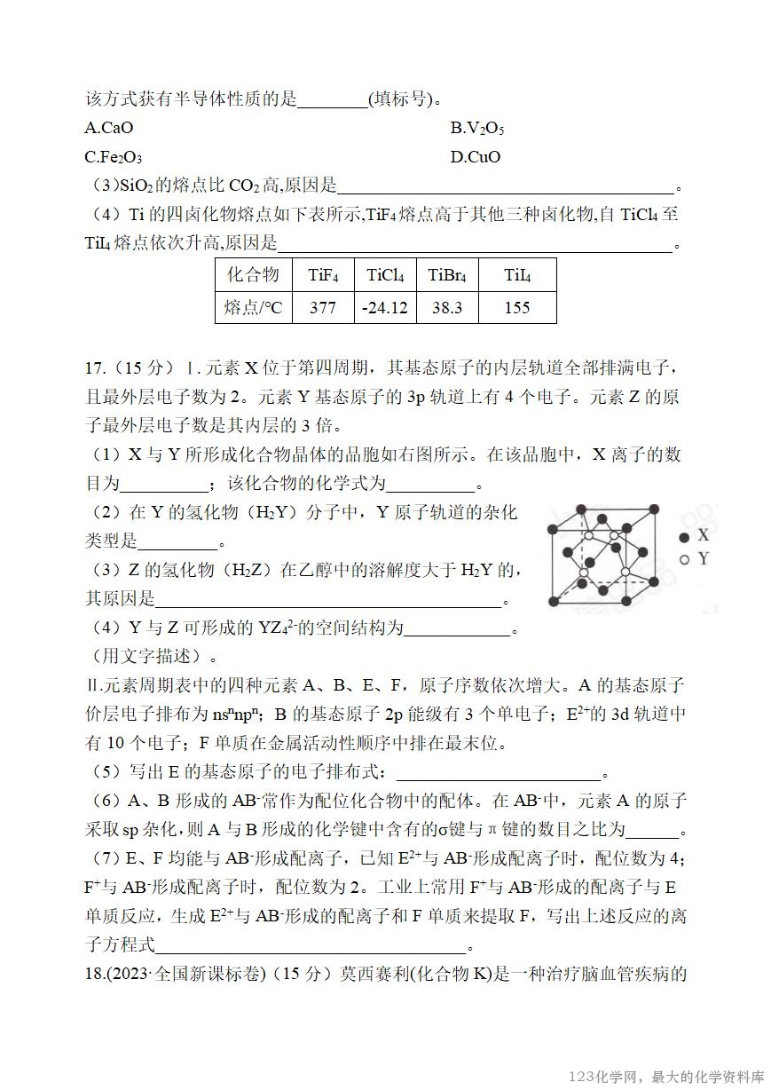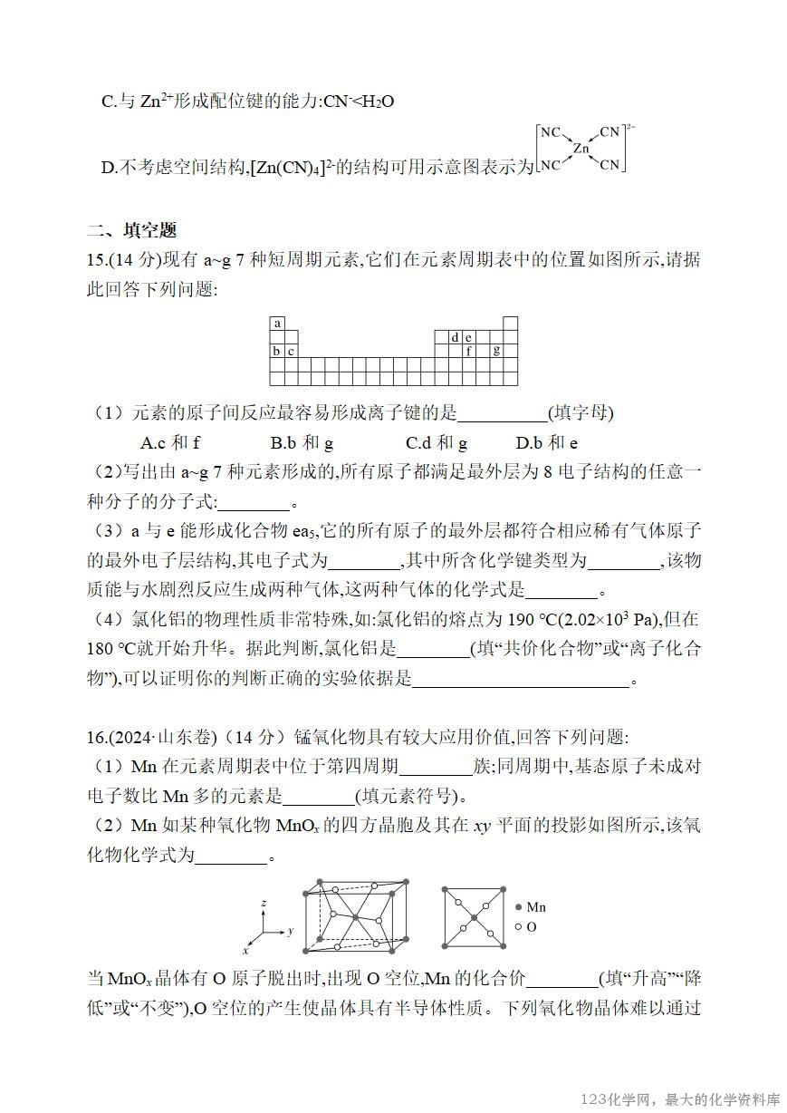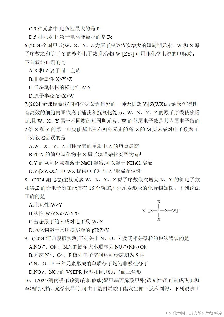 7.(2024·新课标卷)我国科学家最近研究的一种无机盐Y3[Z(WX)6]2纳米药物具有高效的细胞内亚铁离子捕获和抗氧化能力。W、X、Y、Z的原子序数依次增加,且W、X、Y属于不同族的短周期元素。W的外层电子数是其内层电子数的2倍,X和Y的第一电离能都比左右相邻元素的高。Z的M层未成对电子数为4。下列叙述错误的是