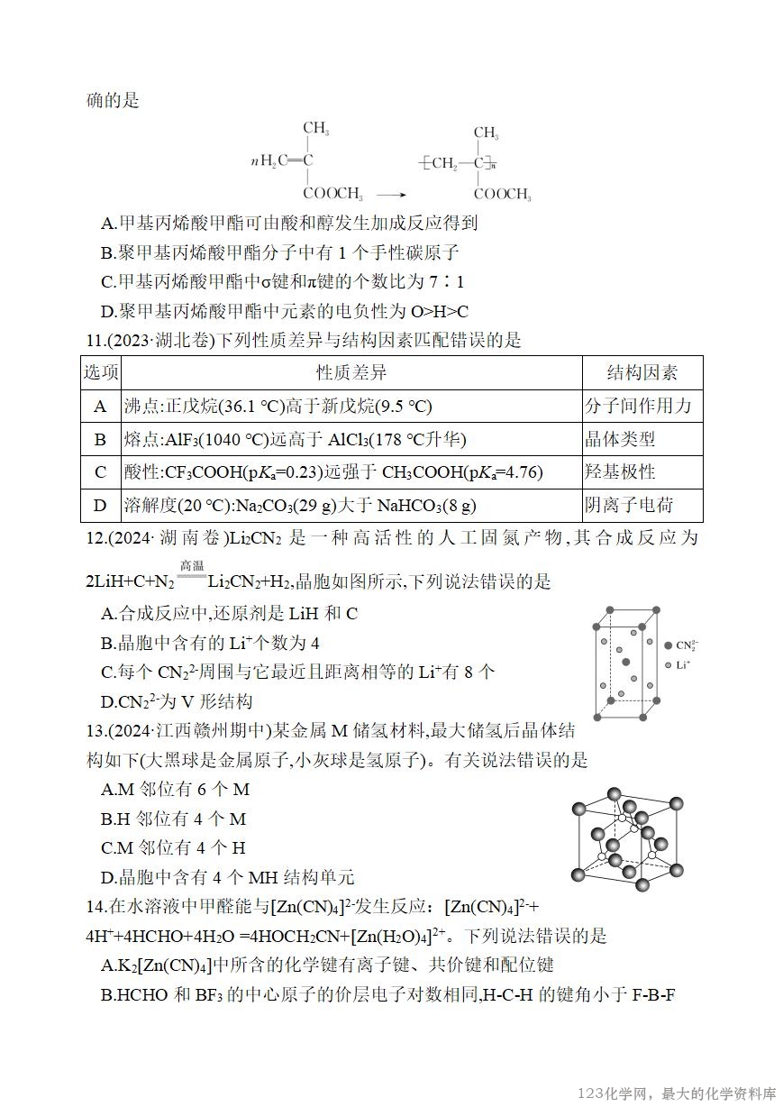 6.(2024·全国甲卷)W、X、Y、Z为原子序数依次增大的短周期元素。W和X原子序数之和等于Y-的核外电子数,化合物W+[ZY6]-可用作化学电源的电解质。下列叙述正确的是