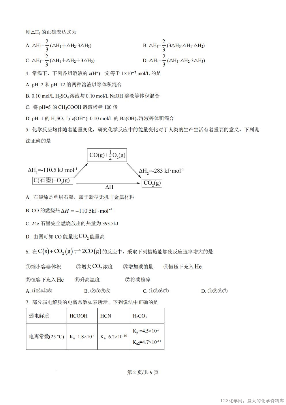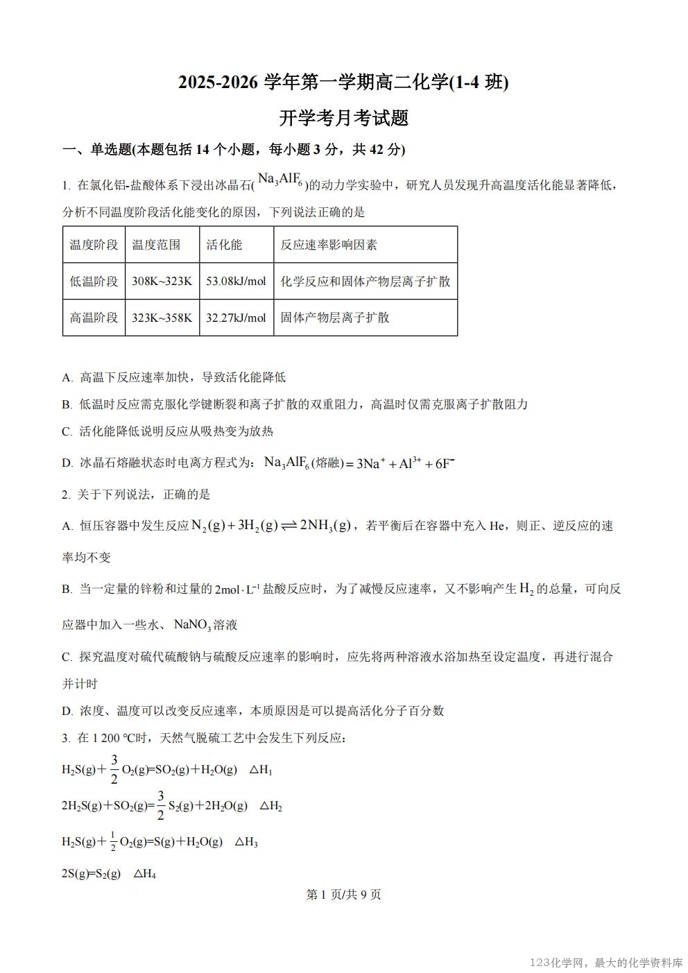 2025-2026 学年第一学期高二化学(1-4 班) 开学考月考试题 一、单选题(本题包括 14 个小题,每小题 3 分,共 42 分) 1. 在氯化铝-盐酸体系下浸出冰晶石( Na AlF 3 6 )的动力学实验中,研究人员发现升高温度活化能显著降低, 分析不同温度阶段活化能变化的原因,下列说法正确的是 温度阶段 温度范围 活化能 反应速率影响因素 低温阶段 308K~323K 53.08kJ/mol 化学反应和固体产物层离子扩散 高温阶段 323K~358K 32.27kJ/mol 固体产物层离子扩散 A. 高温下反应速率加快,导致活化能降低 B. 低温时反应需克服化学键断裂和离子扩散的双重阻力,高温时仅需克服离子扩散阻力 C. 活化能降低说明反应从吸热变为放热 D. 冰晶石熔融状态时电离方程式为: Na AlF 3 6 (熔融) = + + 3Na Al 6F + + - 3 2. 关于下列说法,正确的是 A. 恒压容器中发生反应 2 2 3 N (g) 3H (g) 2NH (g) + ƒ ,若平衡后在容器中充入 He,则正、
