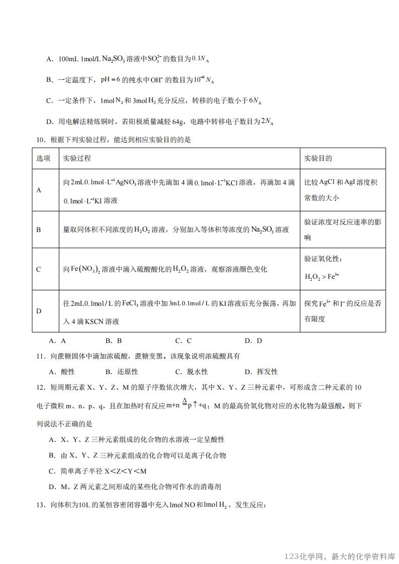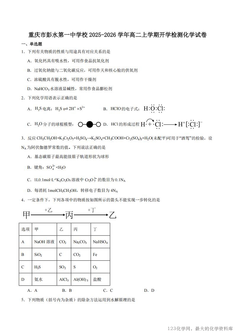 重庆市彭水第一中学校 2025-2026 学年高二上学期开学检测化学试卷 一、单选题 1.下列有关物质的性质与用途具有对应关系的是 A.氧化钙具有吸水性,可用作食品抗氧化剂 B.过氧化钠能与二氧化碳反应,可用作天和核心舱的供氧剂 C.浓硫酸具有脱水性,可用作干燥剂 D.NaHCO3水溶液显碱性,常用作食品膨松剂 2.下列化学用语表示正确的是 A.H S2 电离: 2 H S 2H S 2 + - + ƒ B.HClO的电子式: C.H O2 分子的球棍模型: D.HCl 的形成过程 3.反应 CH3CH2OH+K2Cr2O7+H2SO4→K2SO4+CH3COOH+Cr2(SO4)3+H2O(未配平)可用于“酒驾”的检验,设 NA 为阿伏伽德罗常数的值。下列说法正确的是 A.基态碳原子最高能级原子轨道形状为球形 B.键角:SO 2 4- <H2O C.1L0.1mol·L-1K2Cr2O7溶液中 Cr2O 7 2- 的数目为 0.1NA D.每消耗 1molCH3CH2OH,转移电子数目为 4NA 4.一定条件下,下列各项中的物质按如图所示的箭头不能实现一步转化的是