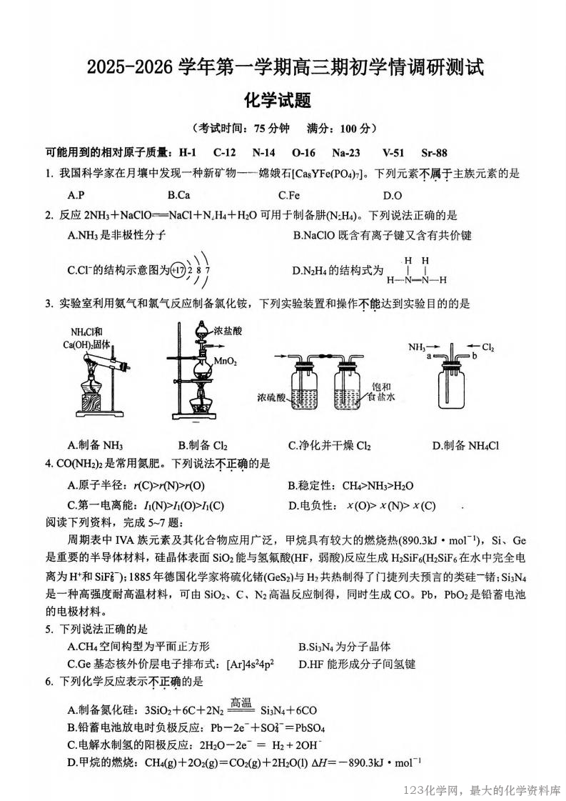 4. CO(NH2)2是常用氮肥。下列说法不正确的是