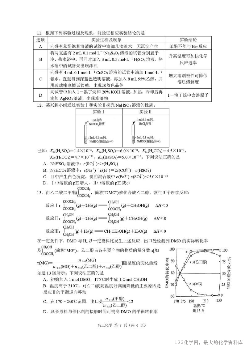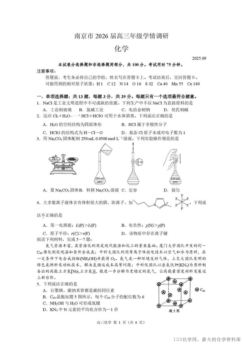 江苏省南京市2026届高三年级学情调研(南京零模)化学试卷含答案