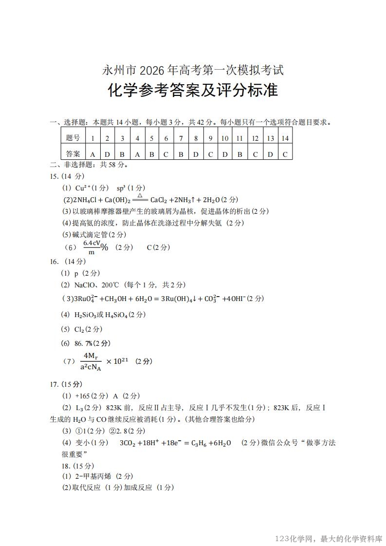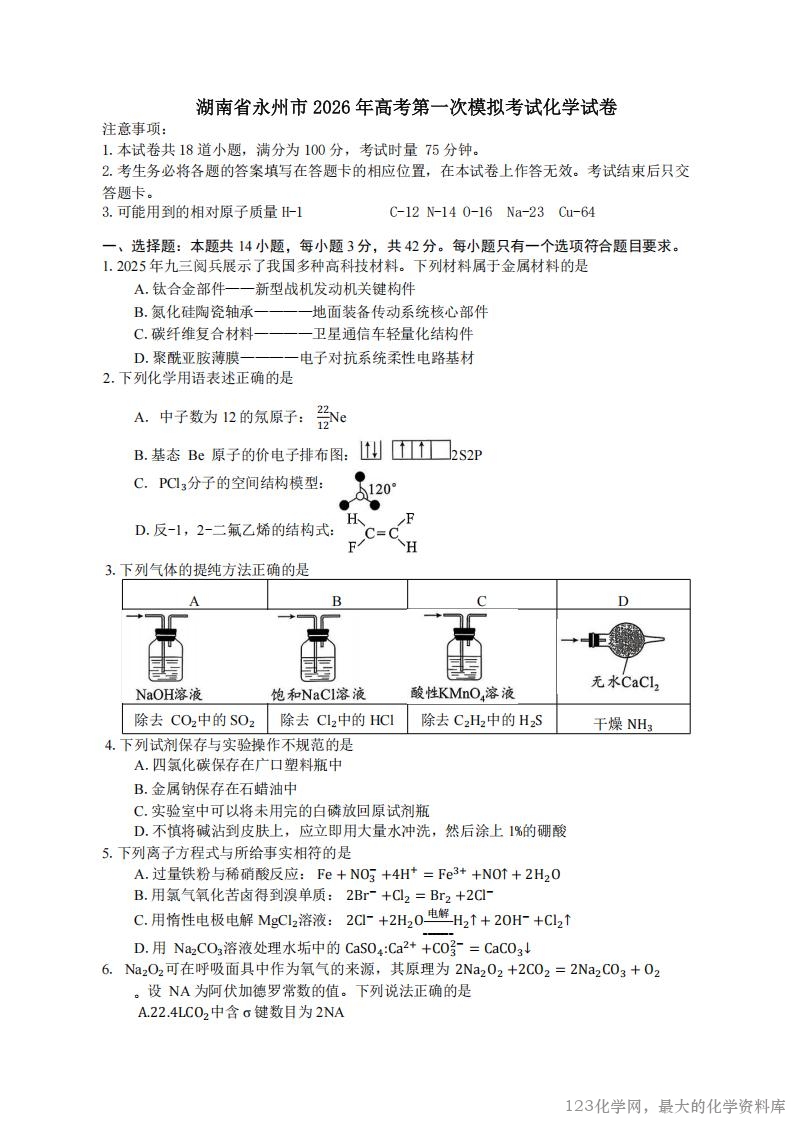 湖南省永州市2026届高三上学期第一次模拟考试(永州一模)(9.17-9.18)化学试卷含答案