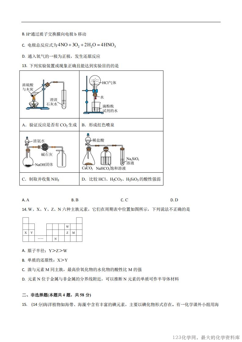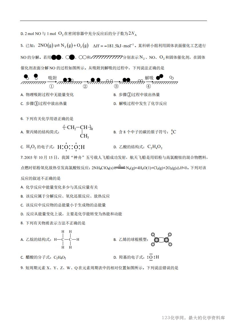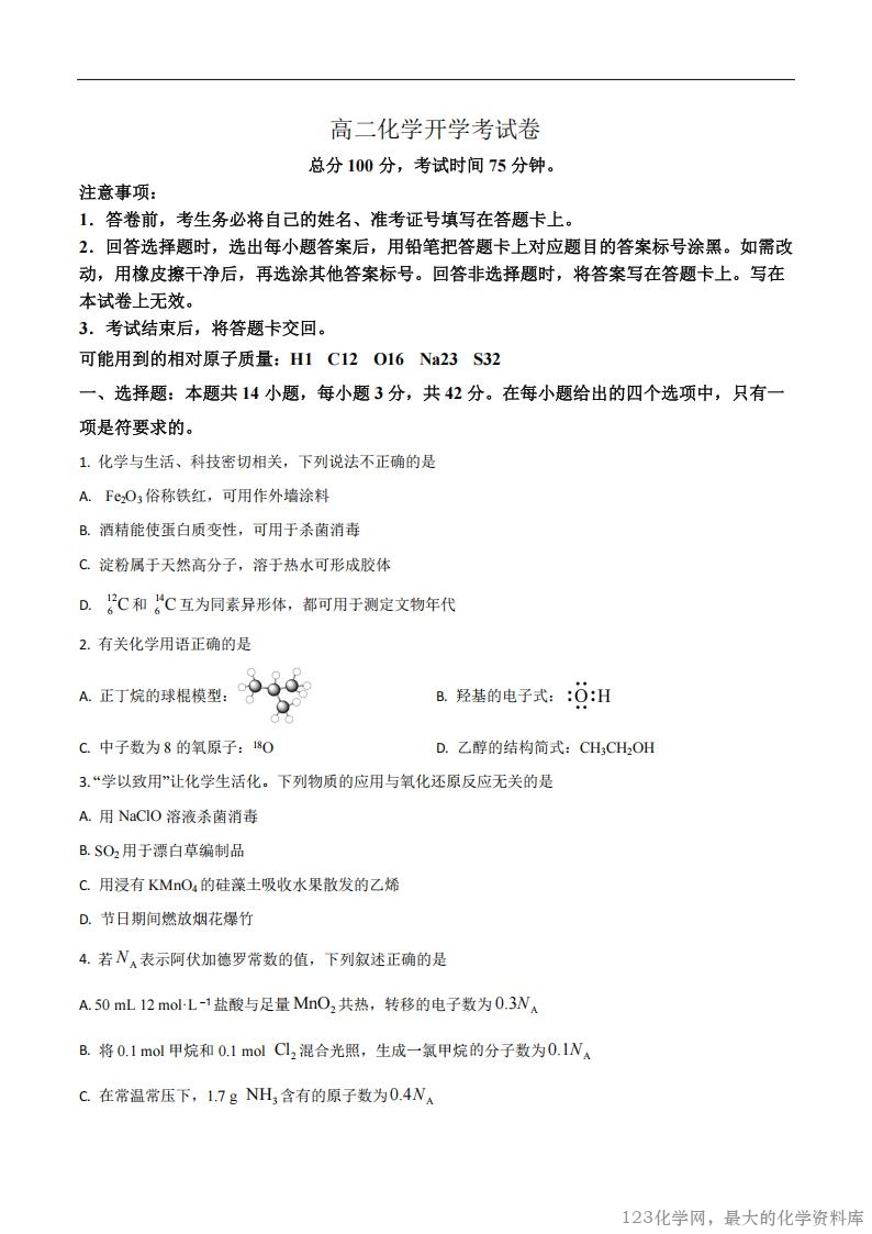 一、选择题:本题共 14 小题,每小题 3 分,共 42 分。在每小题给出的四个选项中,只有一 项是符要求的。 1. 化学与生活、科技密切相关,下列说法不正确的是 A. Fe2O3俗称铁红,可用作外墙涂料 B. 酒精能使蛋白质变性,可用于杀菌消毒 C. 淀粉属于天然高分子,溶于热水可形成胶体 D. 12 6 C和 14 6 C互为同素异形体,都可用于测定文物年代 2. 有关化学用语正确的是 A. 正丁烷的球棍模型: B. 羟基的电子式: C. 中子数为 8 的氧原子:18O D. 乙醇的结构简式:CH3CH2OH 3. “学以致用”让化学生活化。下列物质的应用与氧化还原反应无关的是 A. 用 NaClO 溶液杀菌消毒 B. SO2用于漂白草编制品 C. 用浸有 KMnO4的硅藻土吸收水果散发的乙烯 D. 节日期间燃放烟花爆竹 4. 若 NA 表示阿伏加德罗常数的值,下列叙述正确的是 A. 50 mL 12 mol·L -1 盐酸与足量 MnO2 共热,转移的电子数为0.3NA B. 将 0.1 mol 甲烷和 0.1 mol Cl2 混合光照,生成一氯甲烷 分子数为