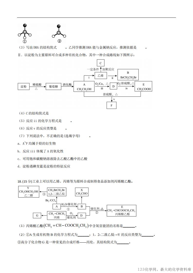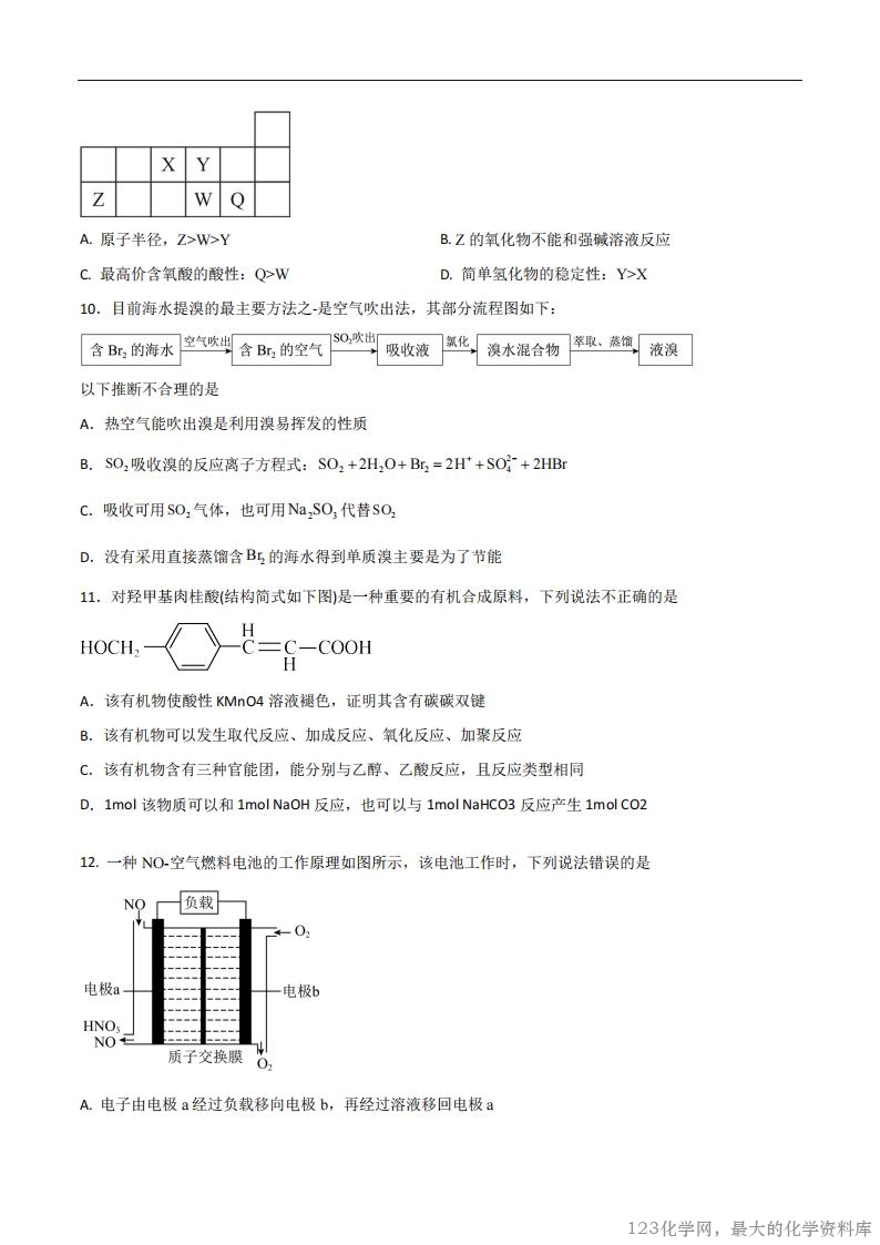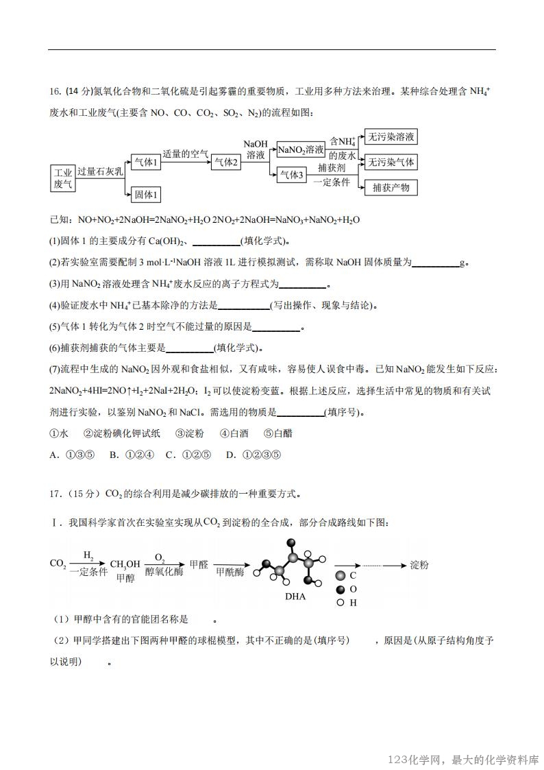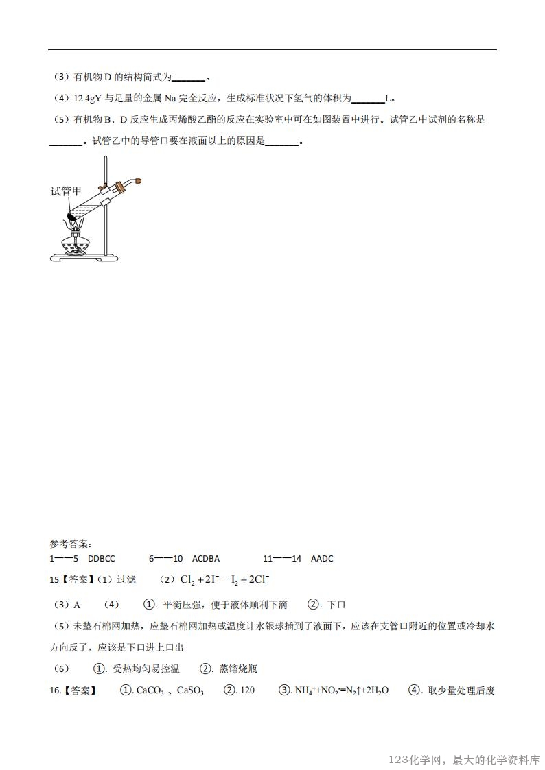 一、选择题:本题共 14 小题,每小题 3 分,共 42 分。在每小题给出的四个选项中,只有一 项是符要求的。 1. 化学与生活、科技密切相关,下列说法不正确的是 A. Fe2O3俗称铁红,可用作外墙涂料 B. 酒精能使蛋白质变性,可用于杀菌消毒 C. 淀粉属于天然高分子,溶于热水可形成胶体 D. 12 6 C和 14 6 C互为同素异形体,都可用于测定文物年代 2. 有关化学用语正确的是 A. 正丁烷的球棍模型: B. 羟基的电子式: C. 中子数为 8 的氧原子:18O D. 乙醇的结构简式:CH3CH2OH 3. “学以致用”让化学生活化。下列物质的应用与氧化还原反应无关的是 A. 用 NaClO 溶液杀菌消毒 B. SO2用于漂白草编制品 C. 用浸有 KMnO4的硅藻土吸收水果散发的乙烯 D. 节日期间燃放烟花爆竹 4. 若 NA 表示阿伏加德罗常数的值,下列叙述正确的是 A. 50 mL 12 mol·L -1 盐酸与足量 MnO2 共热,转移的电子数为0.3NA B. 将 0.1 mol 甲烷和 0.1 mol Cl2 混合光照,生成一氯甲烷 分子数为
