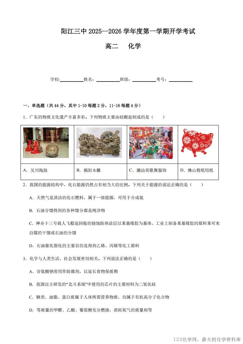 2.阳江三中2025--2026学年度第一学期开学考试化学试卷