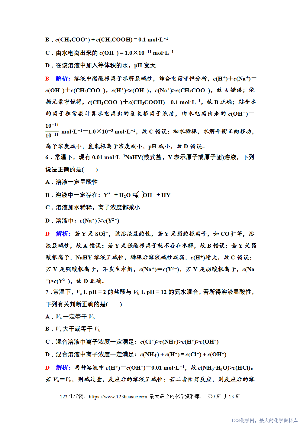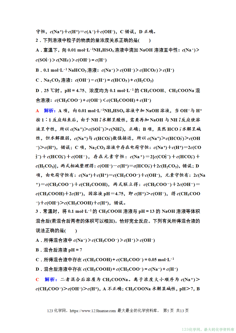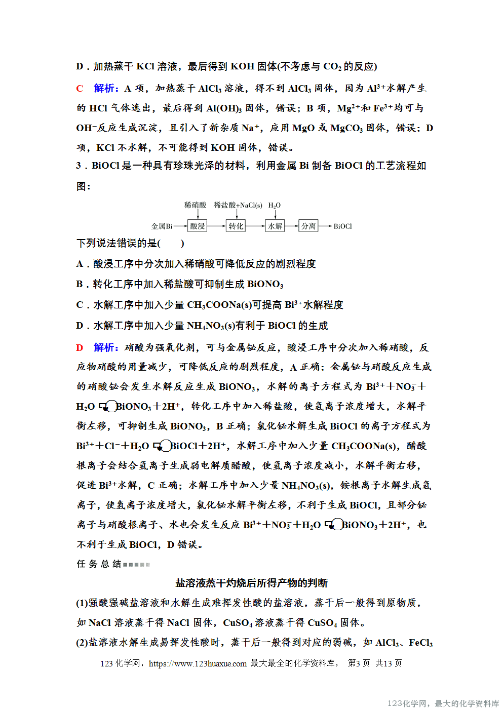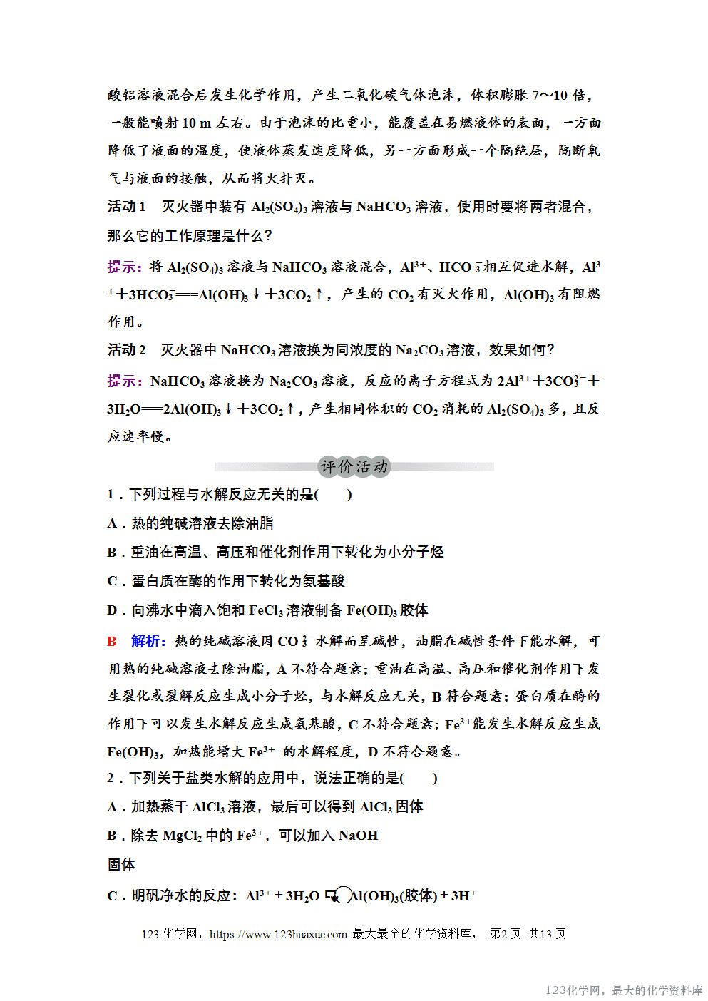B 解析:热的纯碱溶液因CO水解而呈碱性,油脂在碱性条件下能水解,可用热的纯碱溶液去除油脂,A不符合题意;重油在高温、高压和催化剂作用下发生裂化或裂解反应生成小分子烃,与水解反应无关,B符合题意;蛋白质在酶的作用下可以发生水解反应生成氨基酸,C不符合题意;Fe3+能发生水解反应生成 Fe(OH)3,加热能增大Fe3+ 的水解程度,D不符合题意。