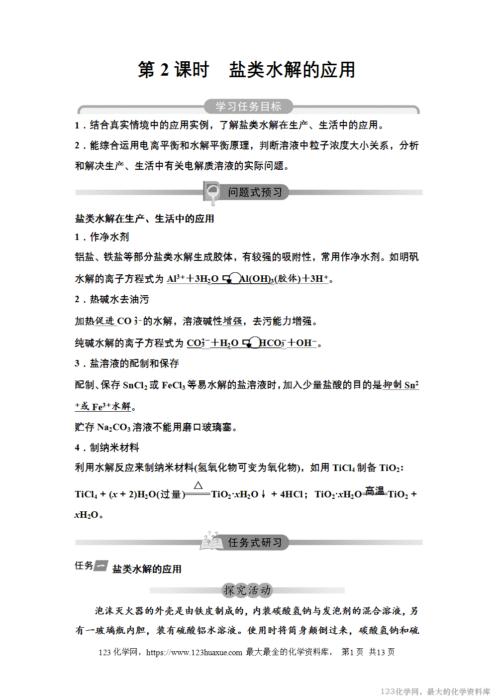 提示:将Al2(SO4)3溶液与NaHCO3溶液混合,Al3+、HCO相互促进水解,Al3++3HCO===Al(OH)3↓+3CO2↑,产生的CO2有灭火作用,Al(OH)3有阻燃作用。