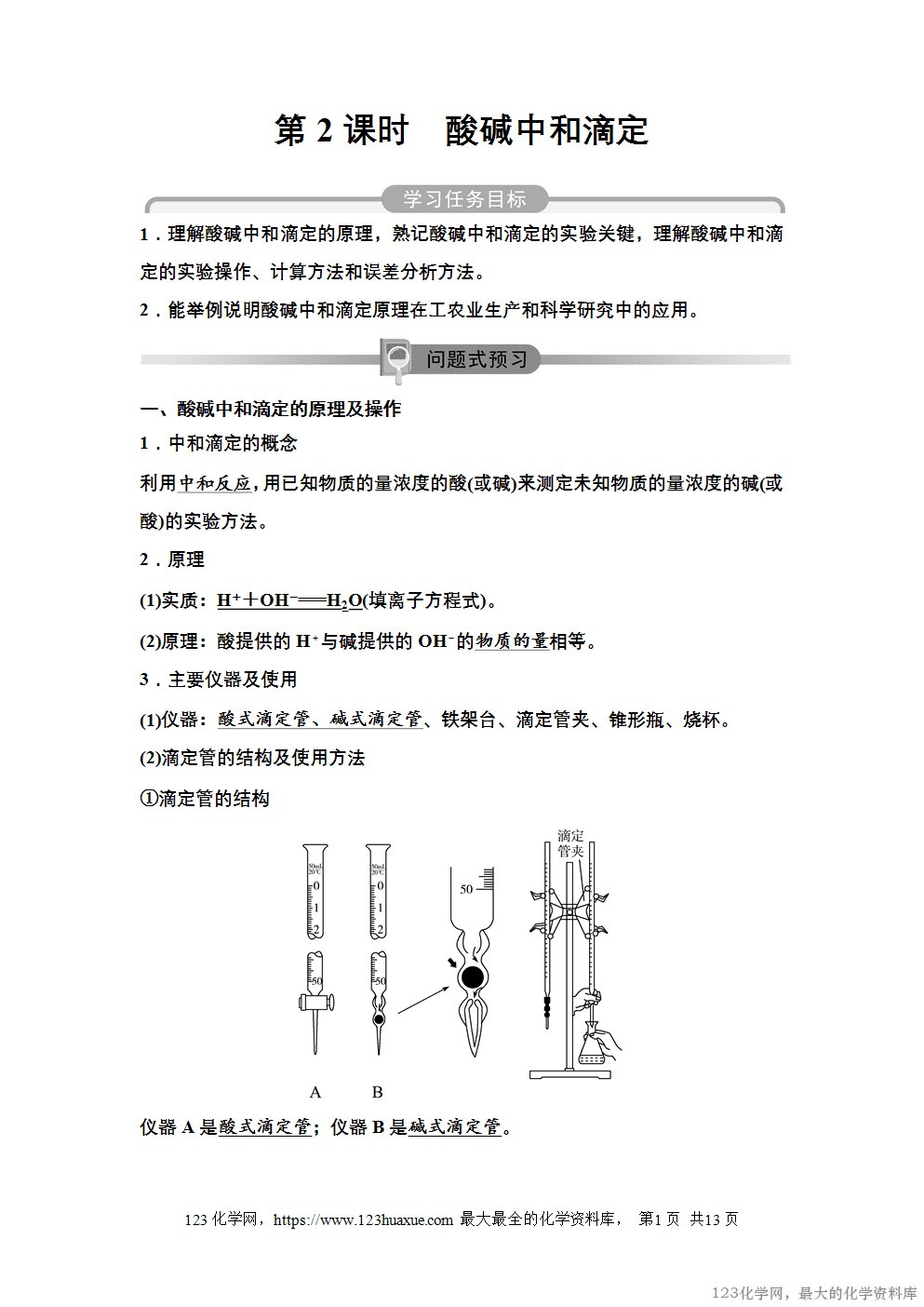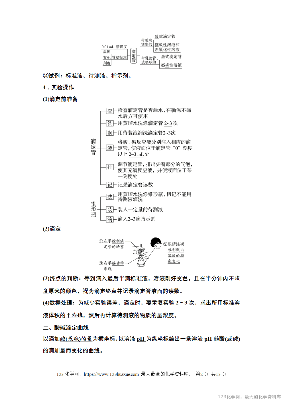 1.理解酸碱中和滴定的原理,熟记酸碱中和滴定的实验关键,理解酸碱中和滴定的实验操作、计算方法和误差分析方法。