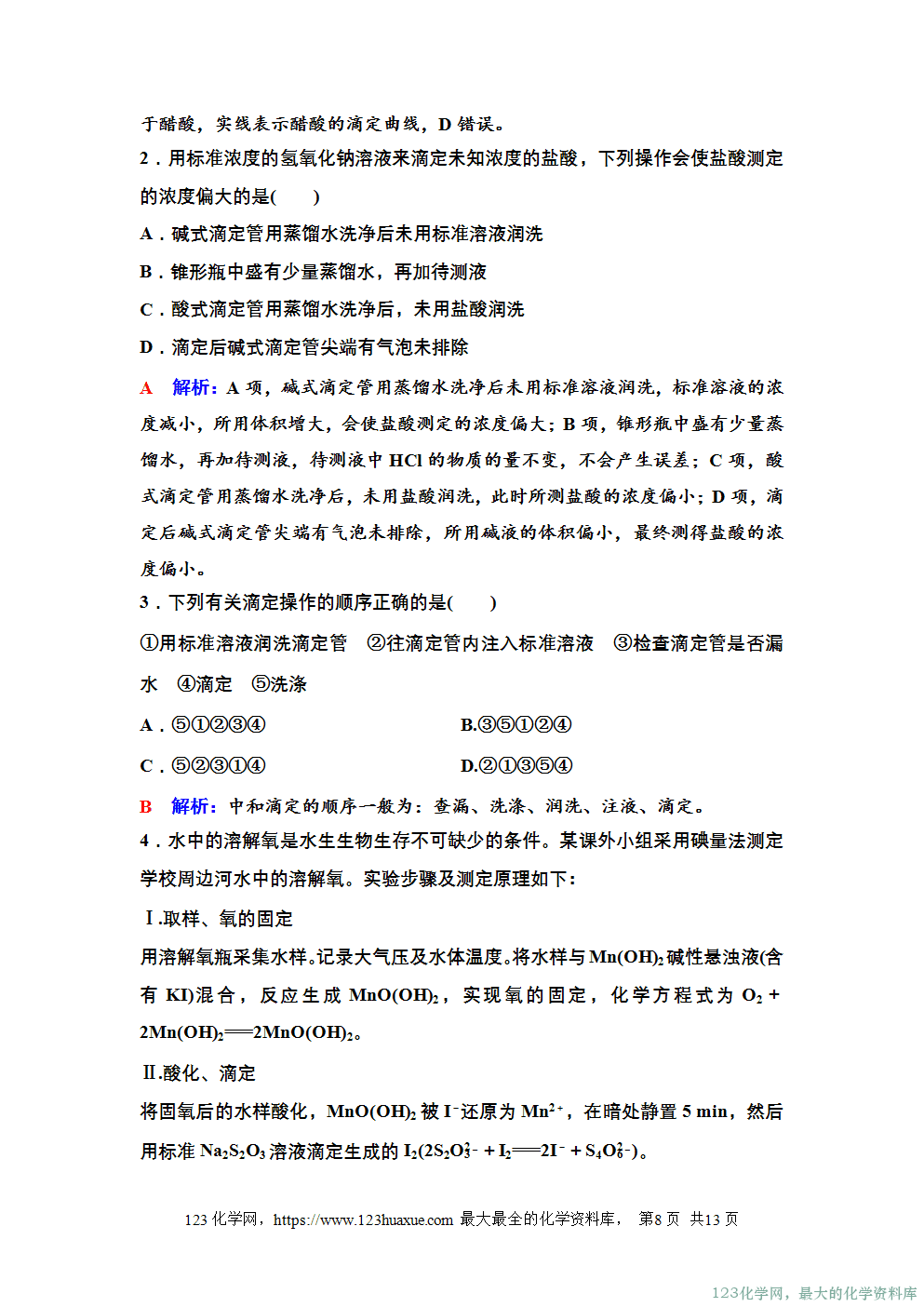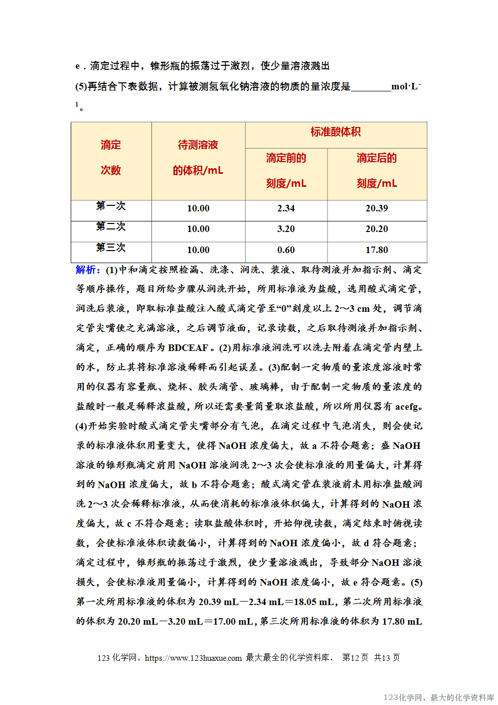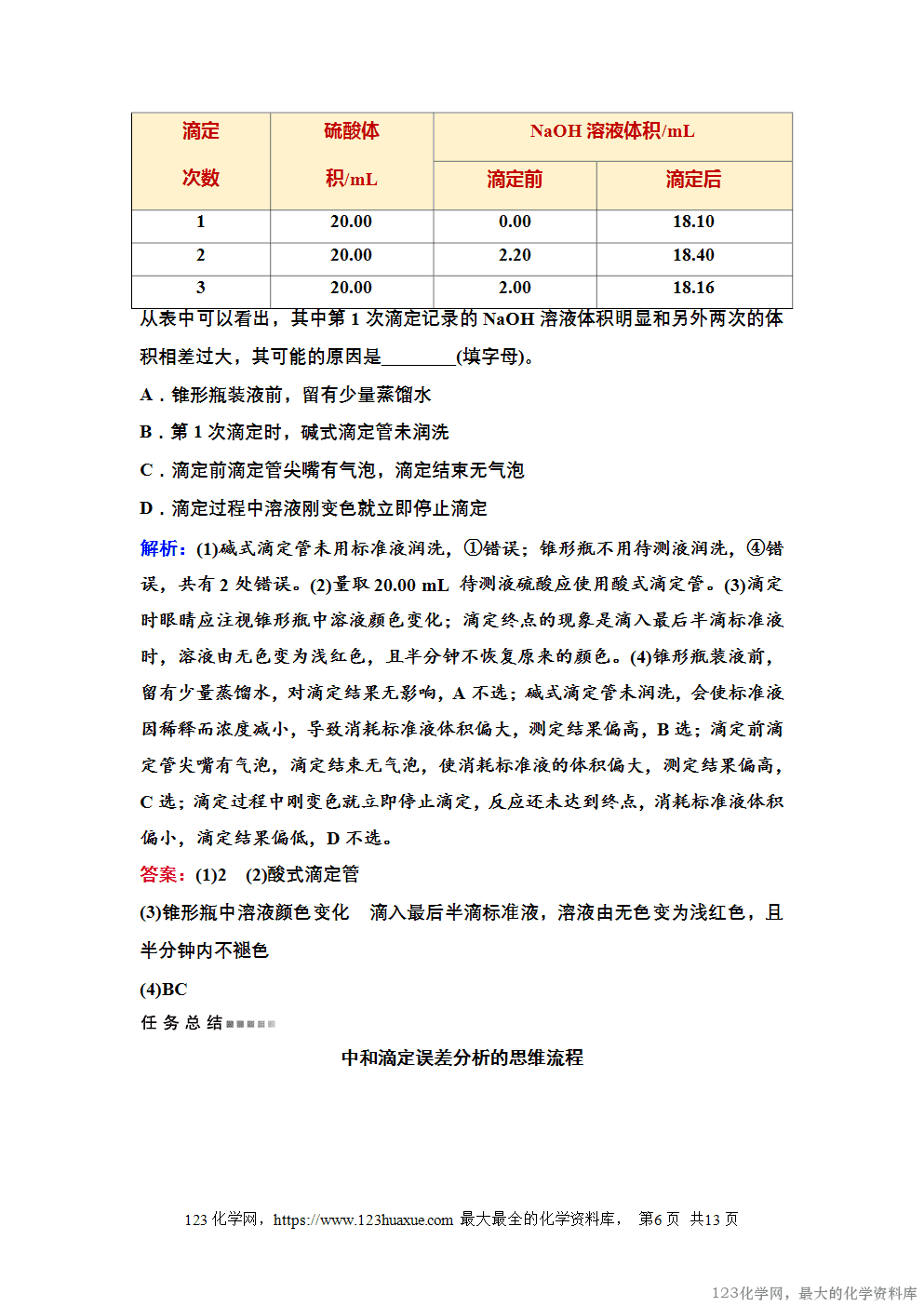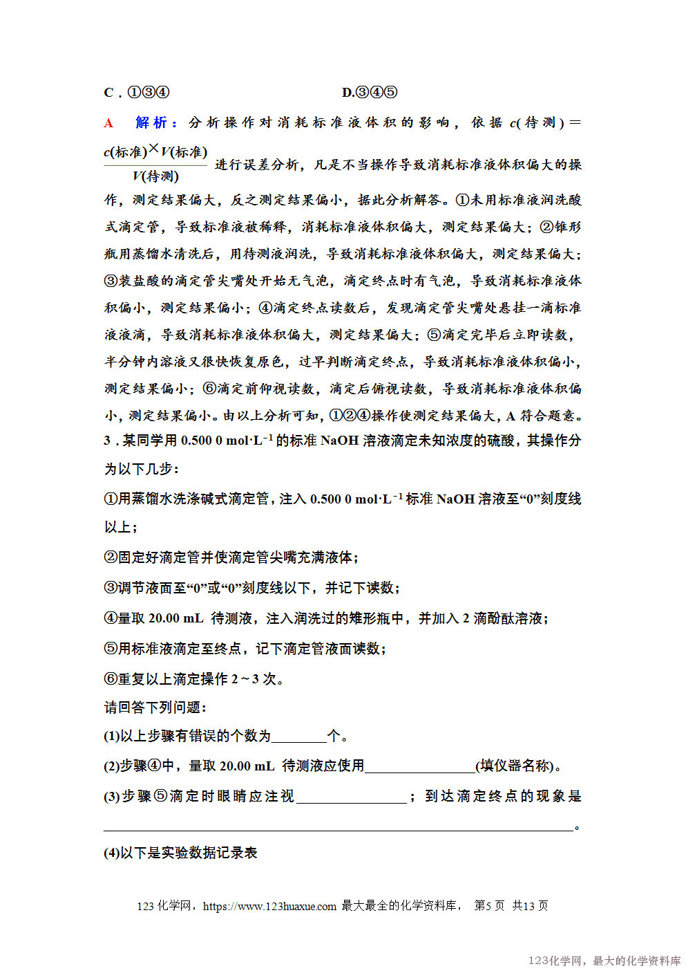 (4)数据处理:为减少实验误差,滴定时,要重复实验2~3次,求出所用标准溶液体积的平均值,然后再计算待测液的物质的量浓度。