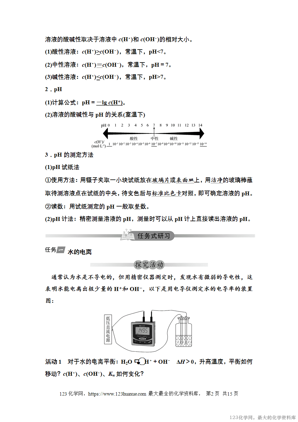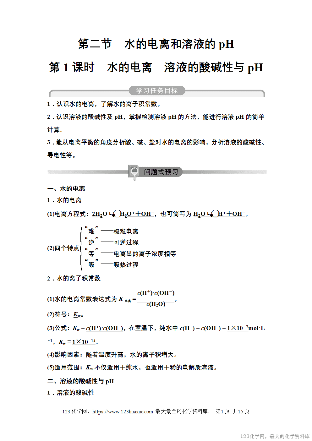(1)电离方程式:2H2OH3O++OH-,也可简写为H2OH++OH-。