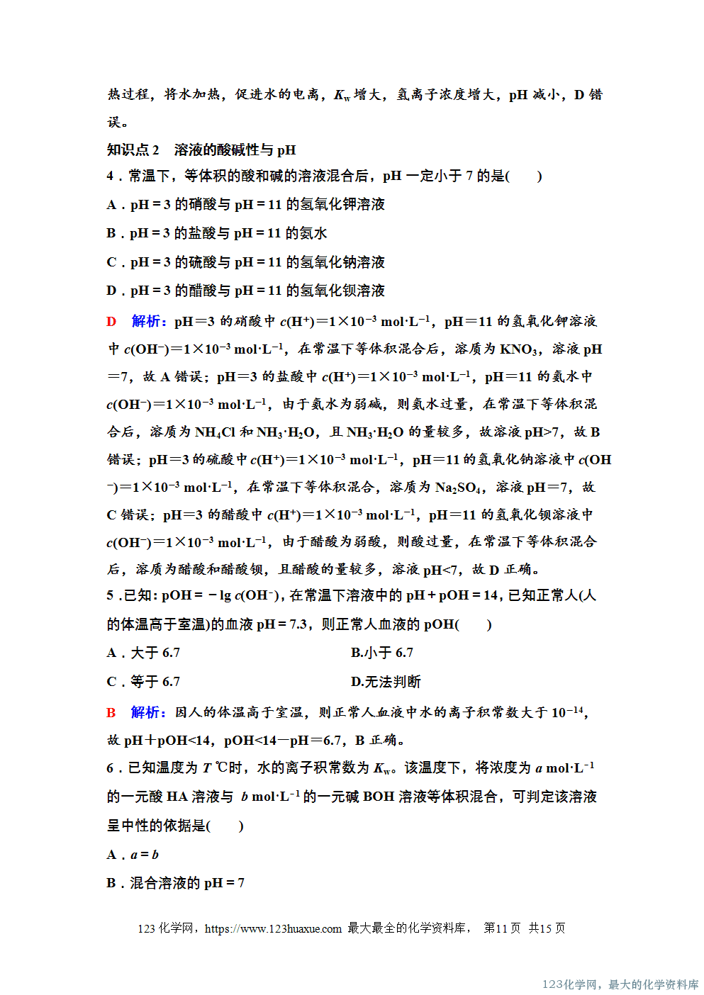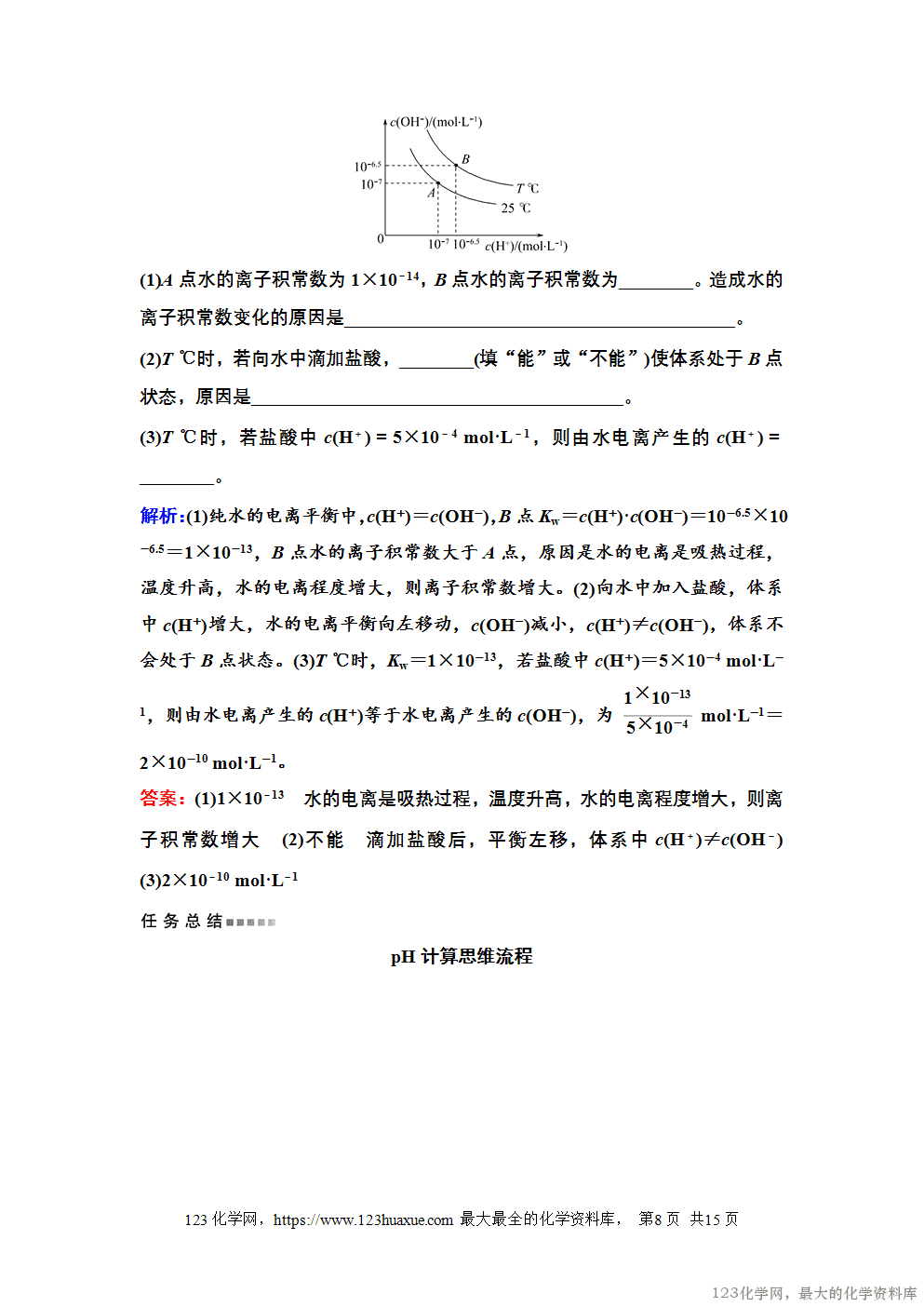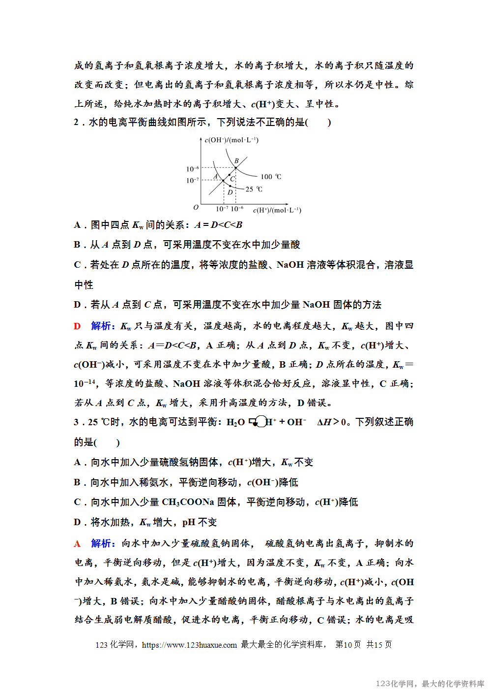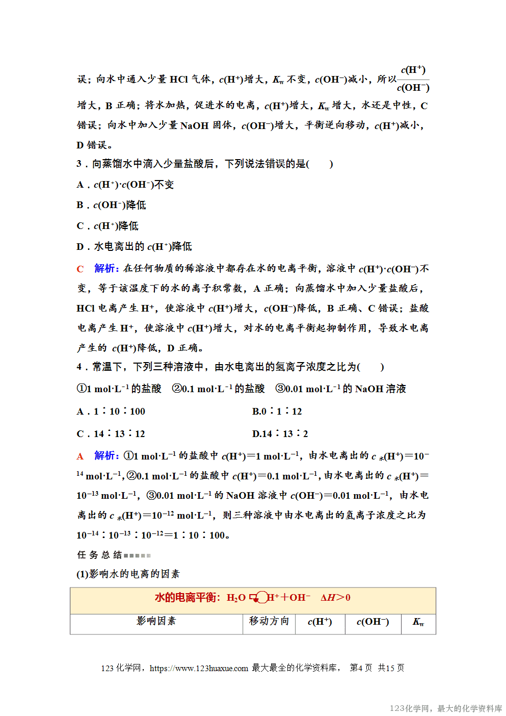 提示:Kw=c(H+)·c(OH-)中,c(H+)、c(OH-)不一定都是水电离出来的。在酸或碱溶液中水电离出的c(H+)与c(OH-)相等。