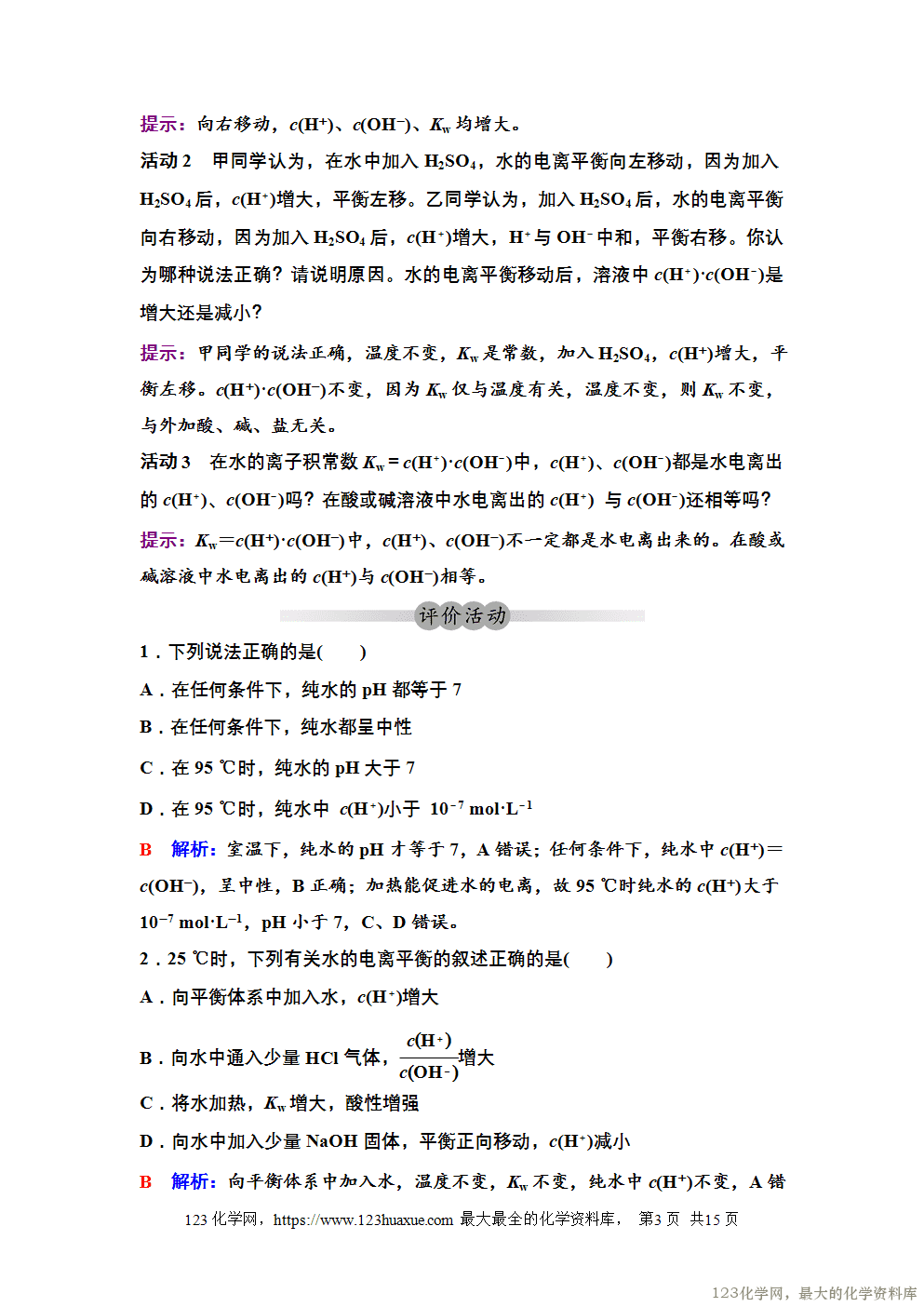 活动2 甲同学认为,在水中加入H2SO4,水的电离平衡向左移动,因为加入H2SO4后,c(H+)增大,平衡左移。乙同学认为,加入H2SO4后,水的电离平衡向右移动,因为加入H2SO4后,c(H+)增大,H+与OH-中和,平衡右移。你认为哪种说法正确?请说明原因。水的电离平衡移动后,溶液中c(H+)·c(OH-)是增大还是减小?