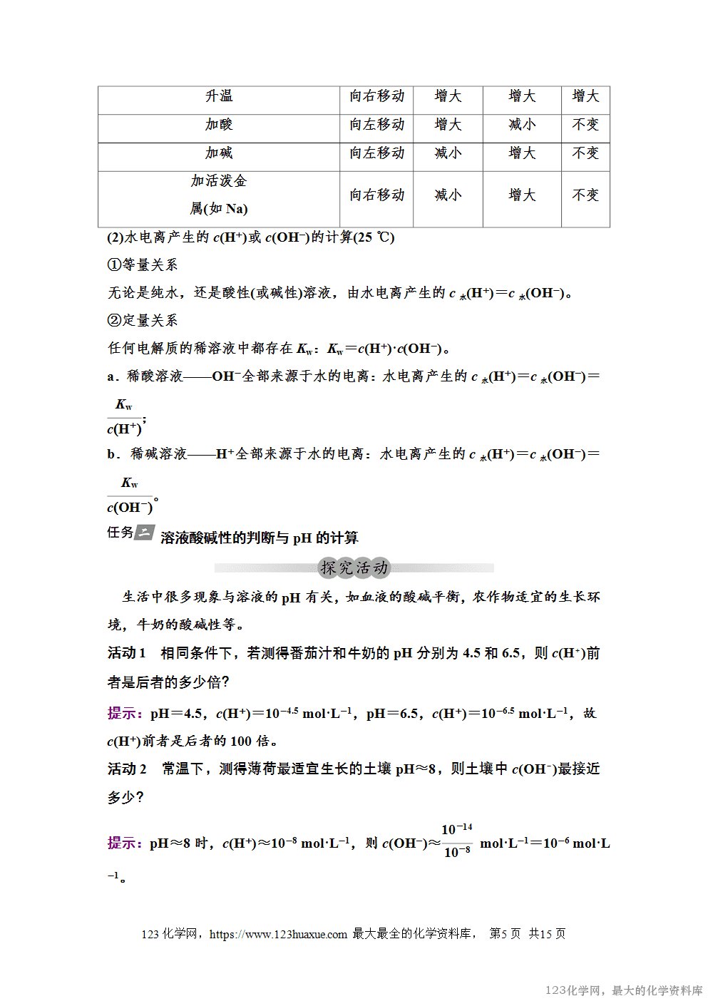 活动1 对于水的电离平衡:H2OH++OH- ΔH>0,升高温度,平衡如何移动?c(H+)、c(OH-)、Kw如何变化?