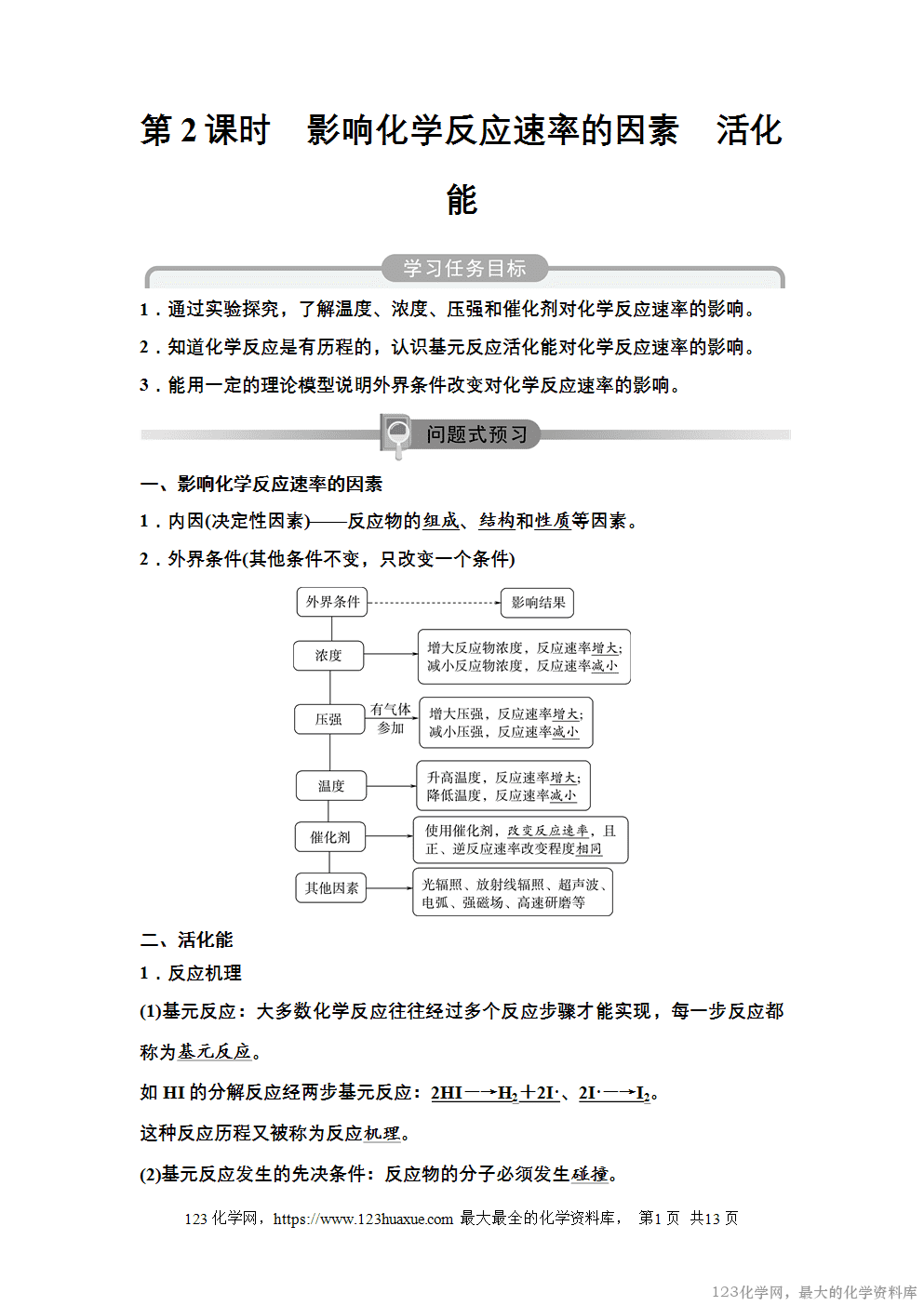 1.内因(决定性因素)——反应物的组成、结构和性质等因素。