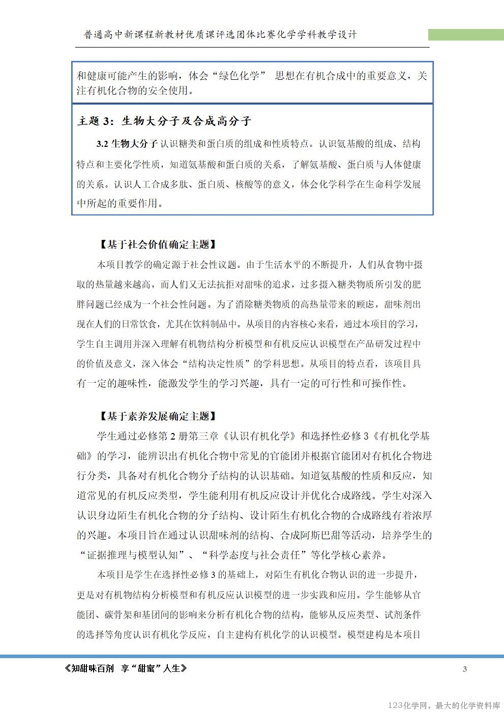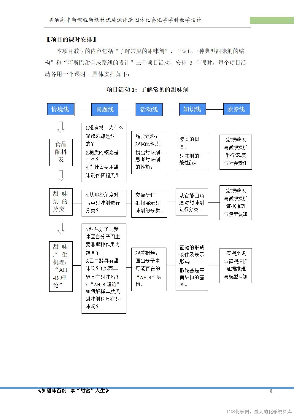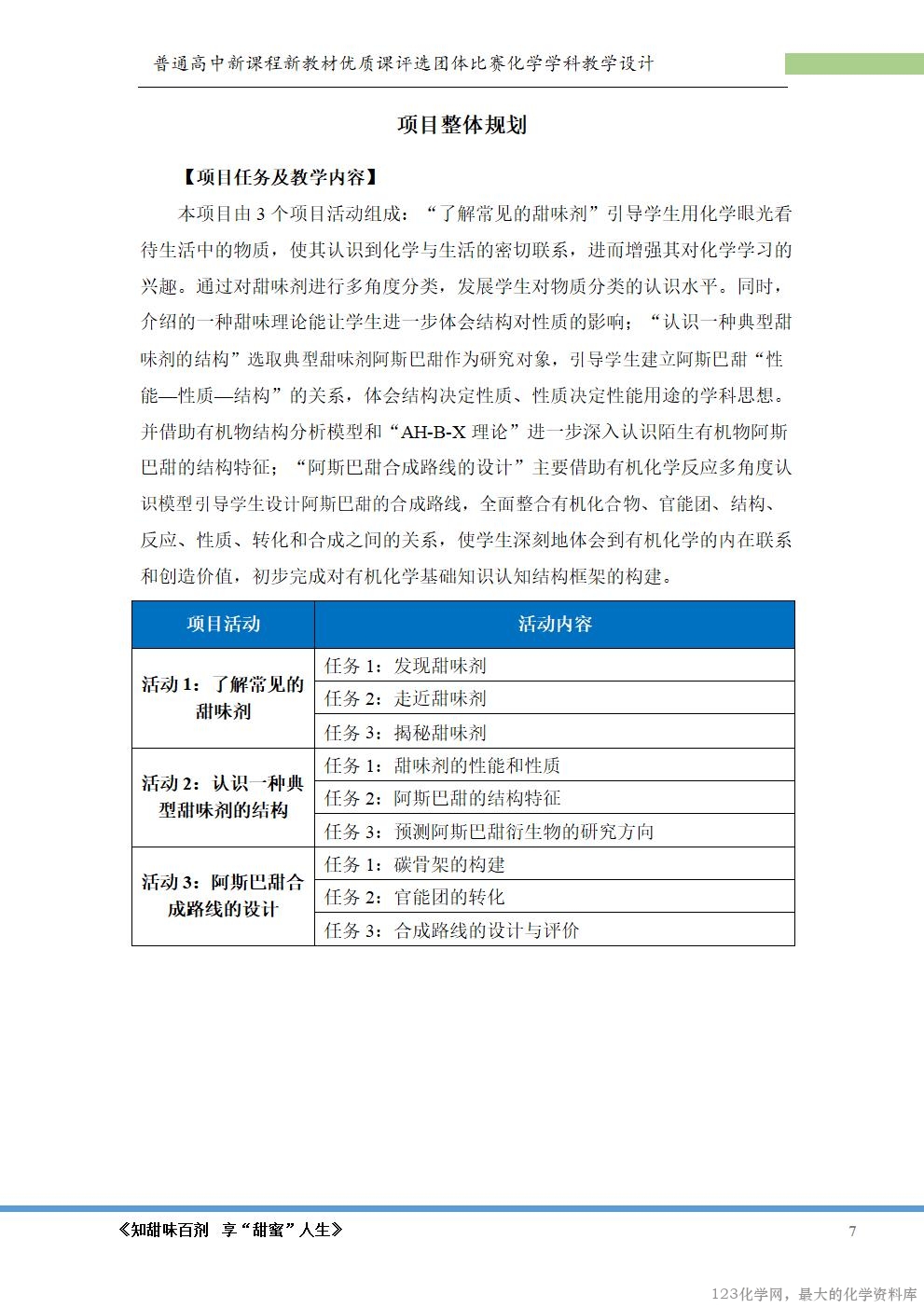 的兴趣。本项目旨在通过认识甜味剂的结构、合成阿斯巴甜等活动,培养学生的