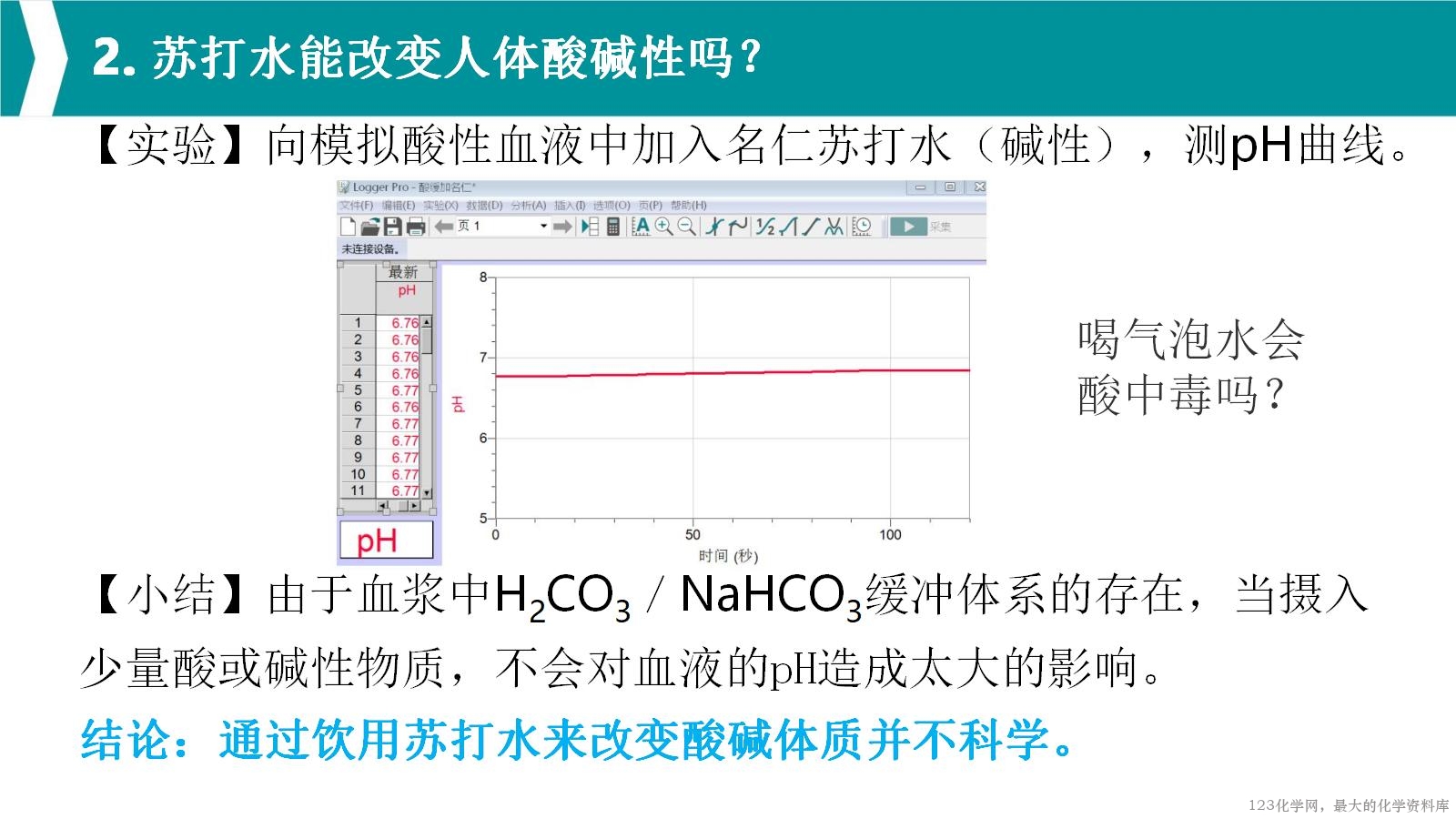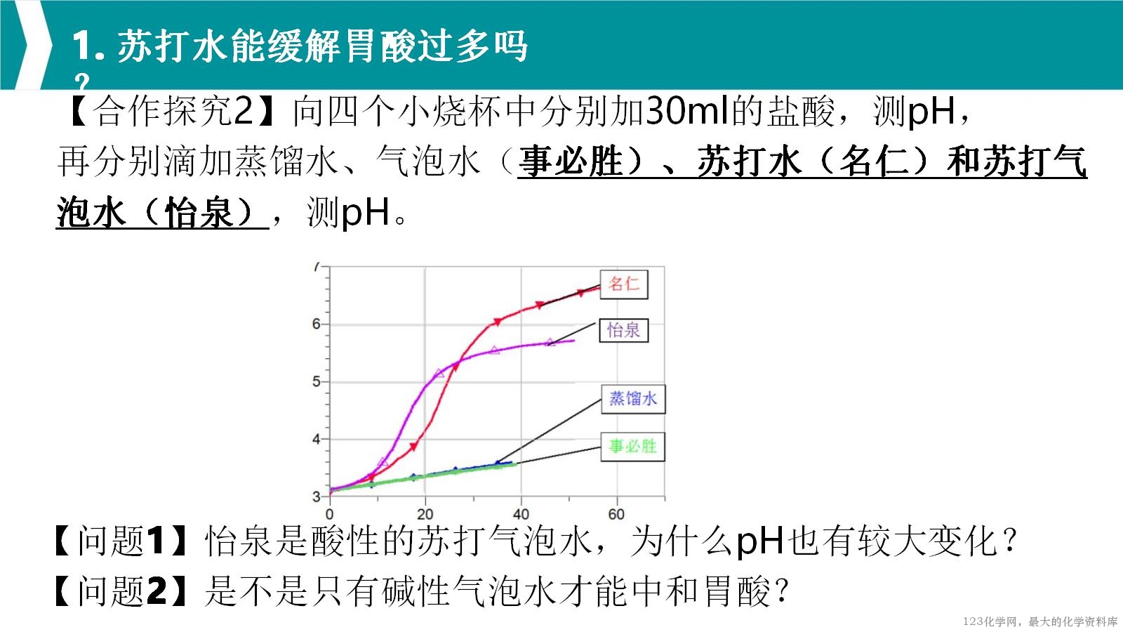 2、学生通过对苏打水能否缓解胃酸、调节人体酸碱性实验方案的探讨与评价,