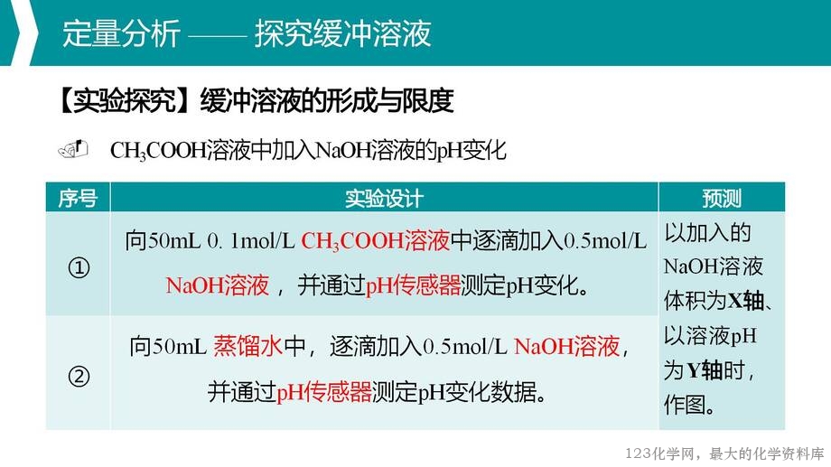 2. 通过数字化实验定量探究缓冲溶液,理解缓冲溶液的形成及其具有限度的特性;