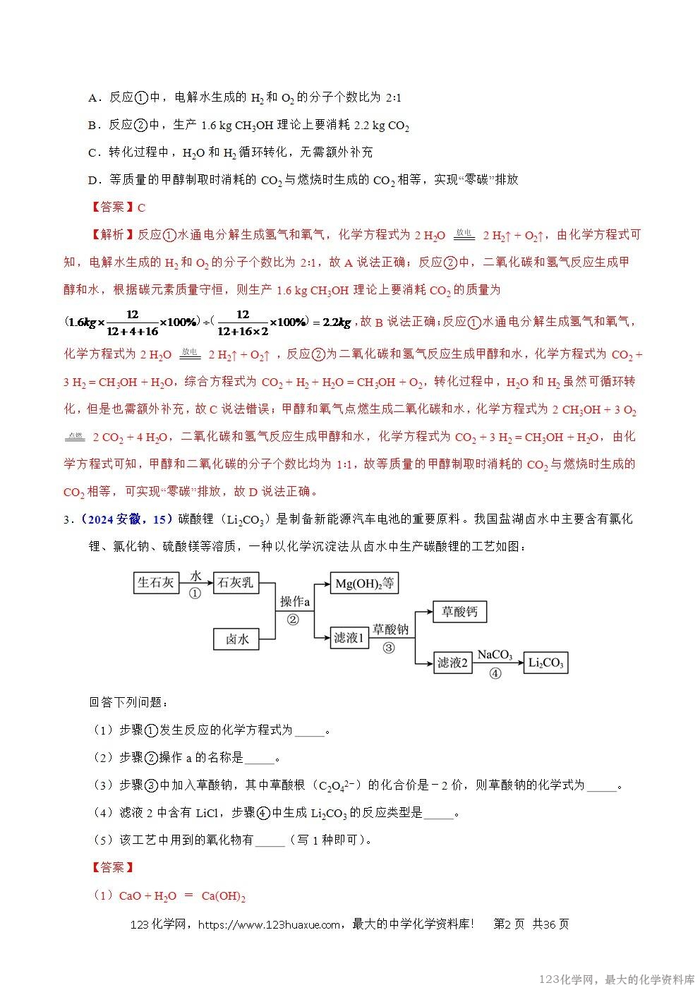 【解析】反应①水通电分解生成氢气和氧气,化学方程式为2 H2O  2 H2↑ + O2↑,由化学方程式可知,电解水生成的H2和O2的分子个数比为2∶1,故A说法正确;反应②中,二氧化碳和氢气反应生成甲醇和水,根据碳元素质量守恒,则生产1.6 kg CH3OH理论上要消耗CO2的质量为,故B说法正确;反应①水通电分解生成氢气和氧气,化学方程式为2 H2O  2 H2↑ + O2↑ ,反应②为二氧化碳和氢气反应生成甲醇和水,化学方程式为CO2 + 3 H2 = CH3OH + H2O,综合方程式为CO2 + H2 + H2O = CH3OH + O2,转化过程中,H2O和H2虽然可循环转化,但是也需额外补充,故C说法错误;甲醇和氧气点燃生成二氧化碳和水,化学方程式为2 CH3OH + 3 O2  2 CO2 + 4 H2O,二氧化碳和氢气反应生成甲醇和水,化学方程式为CO2 + 3 H2 = CH3OH + H2O,由化学方程式可知,甲醇和二氧化碳的分子个数比均为1∶1,故等质量的甲醇制取时消耗的CO2与燃烧时生成的CO2相等,可实现“零碳”排放,故D说法正确。