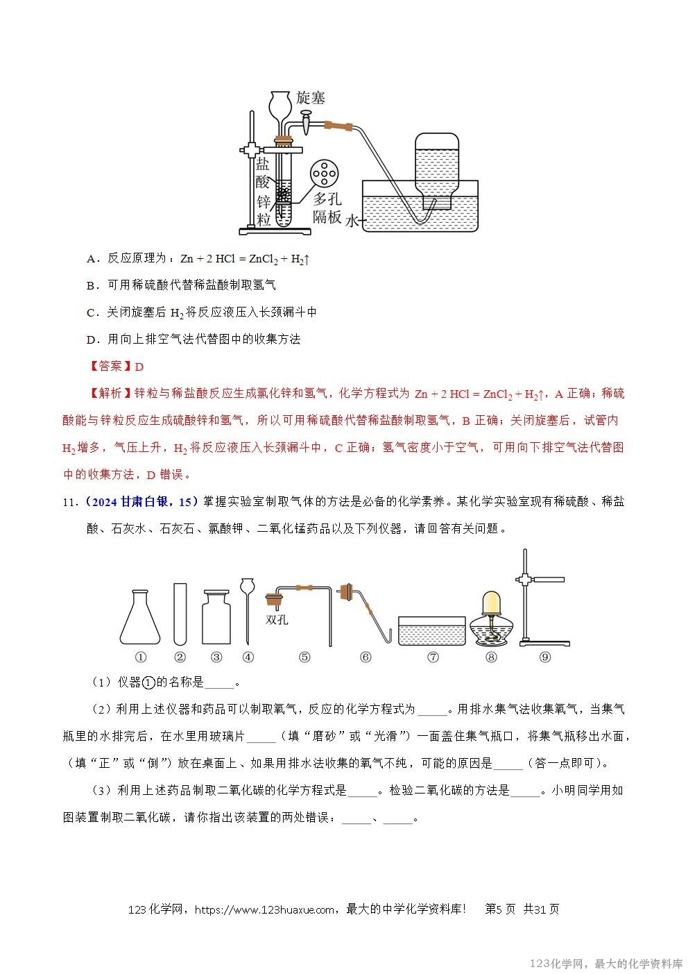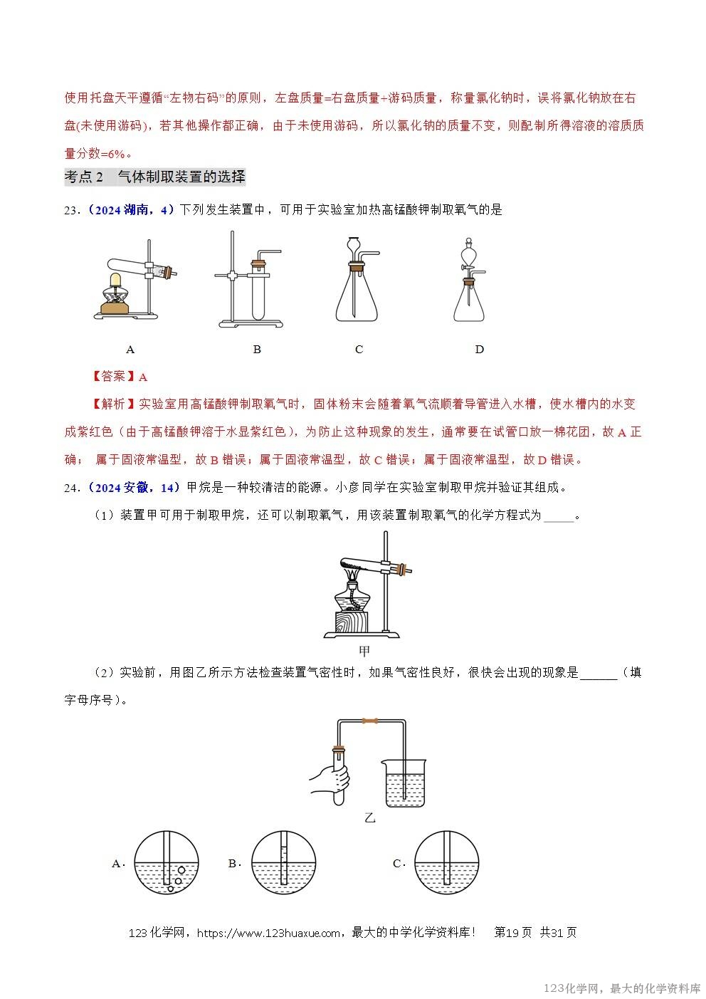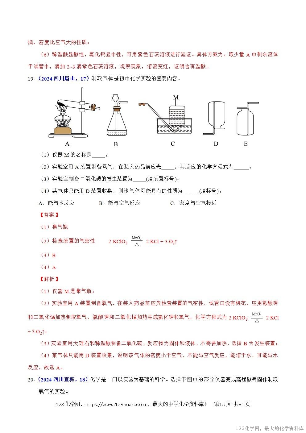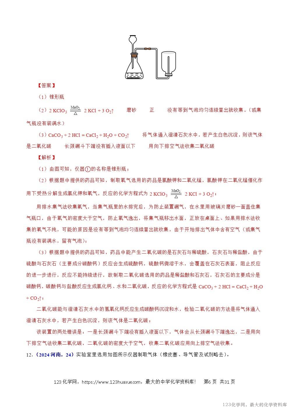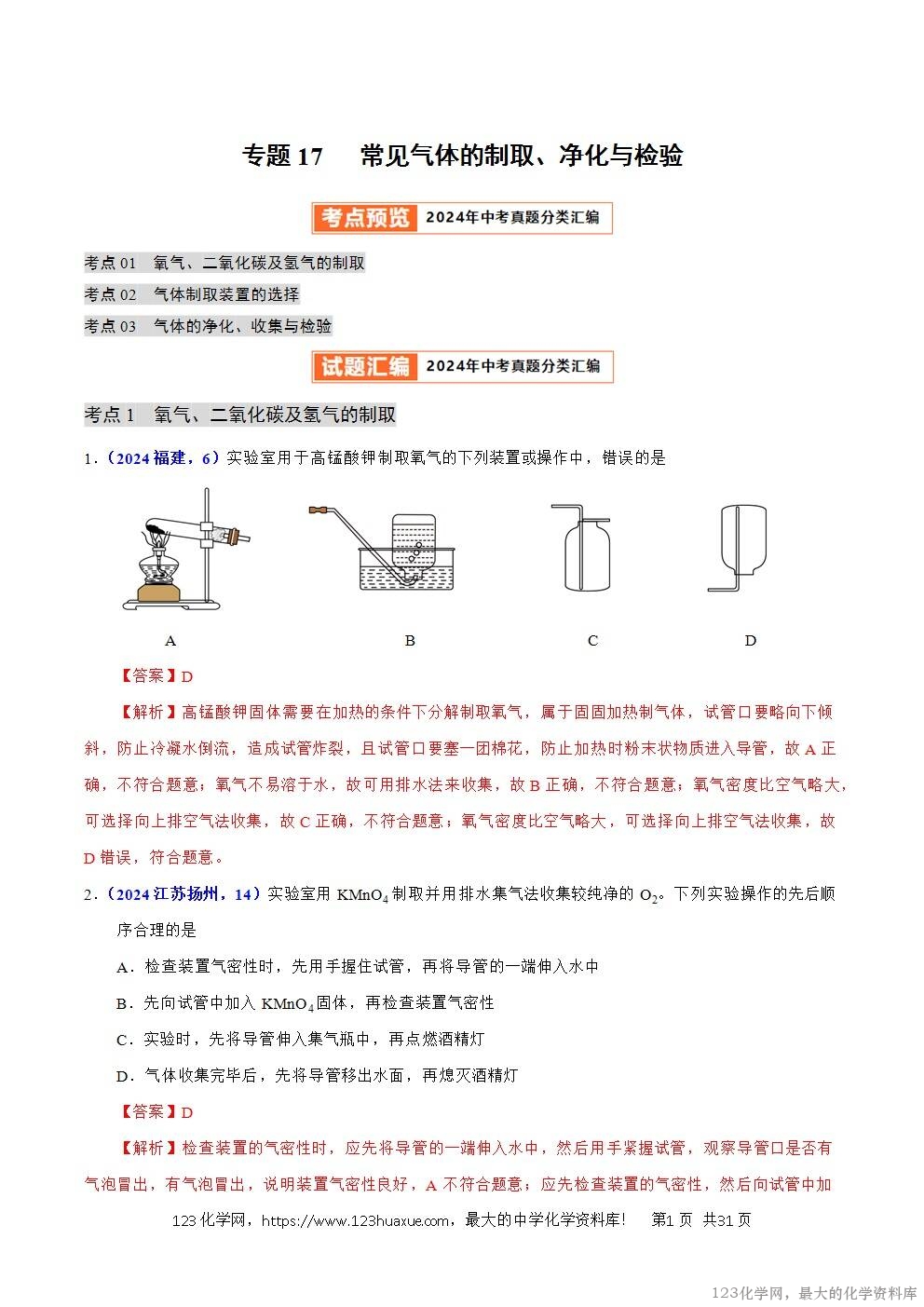 2024年中考化学试卷分类汇编专题17常见气体的制取、净化与检验解析版word版