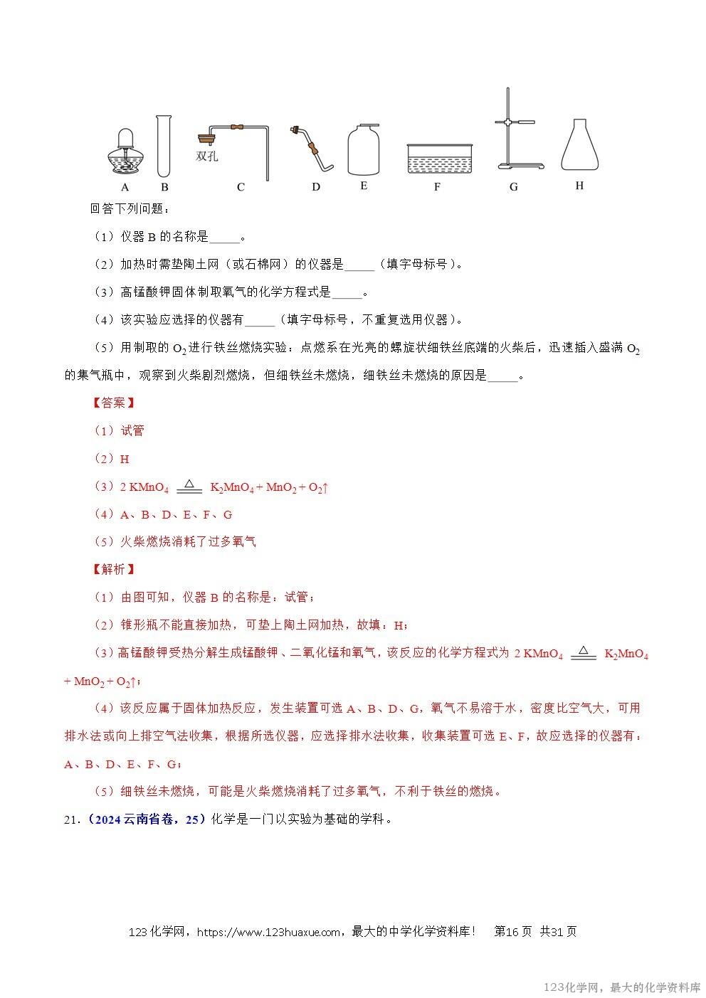 【解析】高锰酸钾加热分解生成锰酸钾、二氧化锰和氧气,该反应的反应物是固体,反应条件是加热,属于固体加热型,氧气密度略大于空气,不易溶于水,可用向上排空气法收集或排水法收集。酒精灯用于加热,使高锰酸钾分解,A不符合题意;试管用于高锰酸钾分解的反应容器,B不符合题意;反应是在试管内进行的,不需要过滤或其他需要漏斗的操作,漏斗在此实验中并不需要,C符合题意;集气瓶用于收集生成的氧气,D不符合题意。
