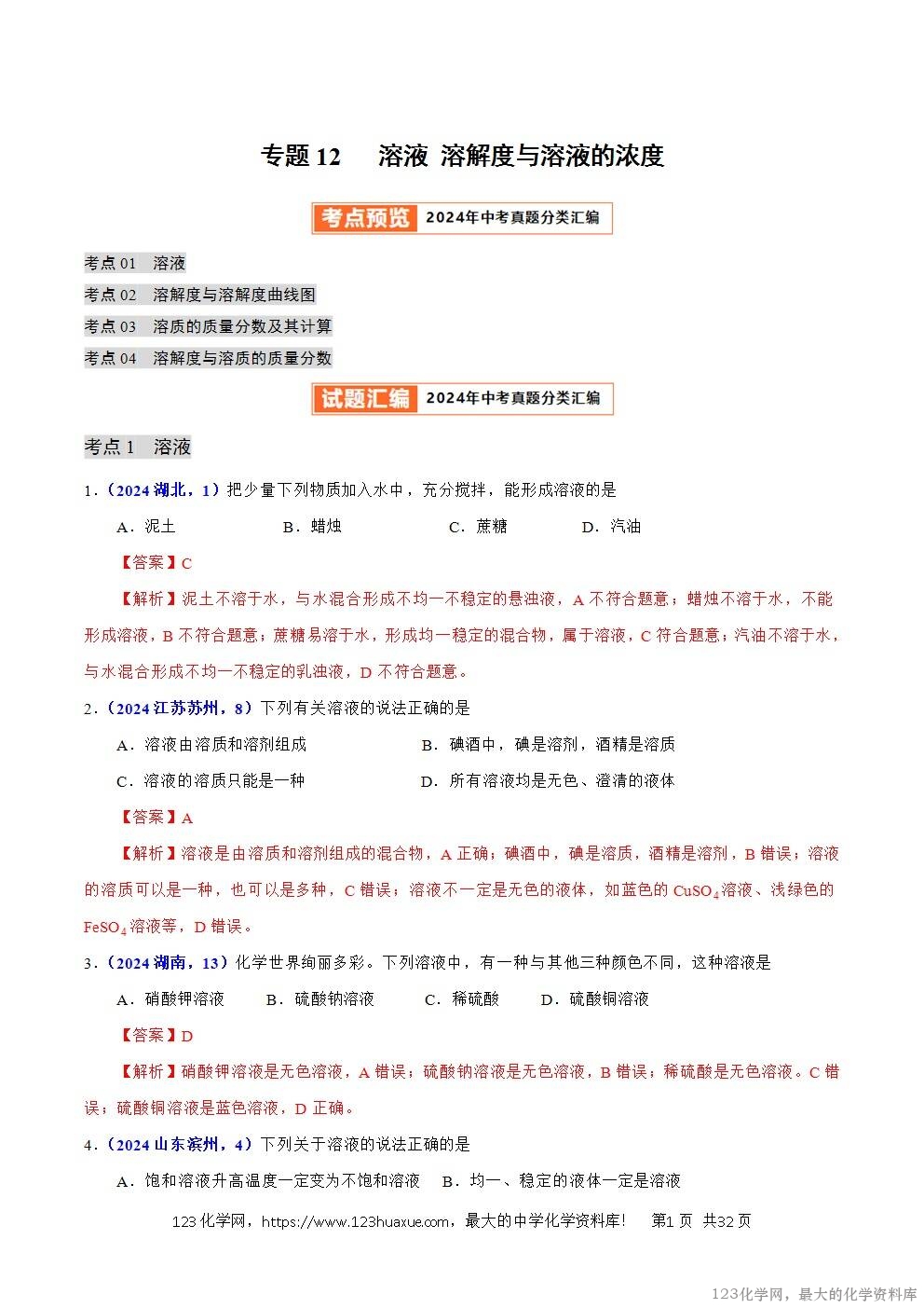 1.(2024湖北,1)把少量下列物质加入水中,充分搅拌,能形成溶液的是